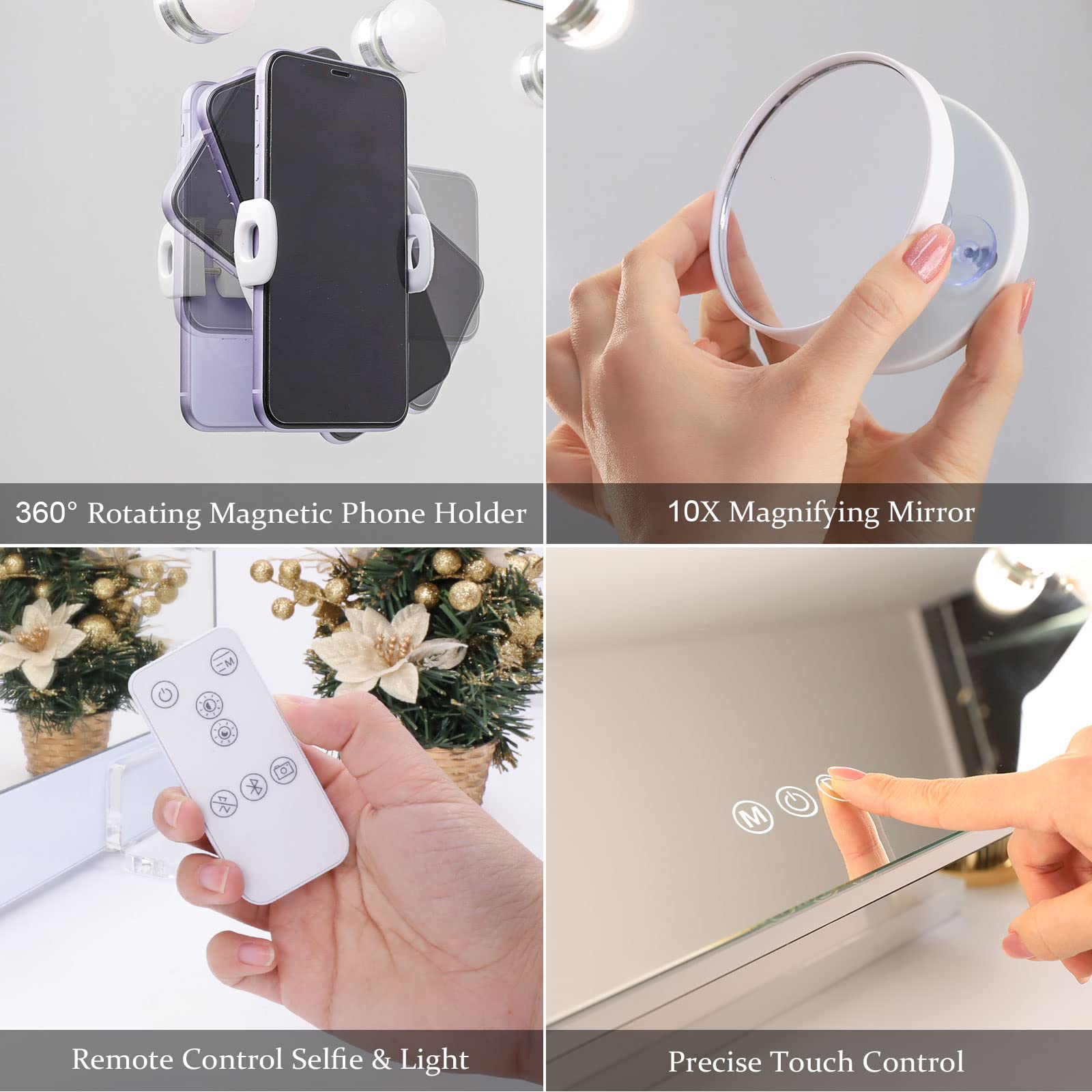 - Magnet Phone Holder: Equipped with a 360-degree rotating magnetic phone holder mount on makeup vanity mirror, so that you can browse makeup videos or watch TV, or message others when you make up. Also, you can take selfies through remote control by fixing the phone on the hollywood vanity mirror with lights.