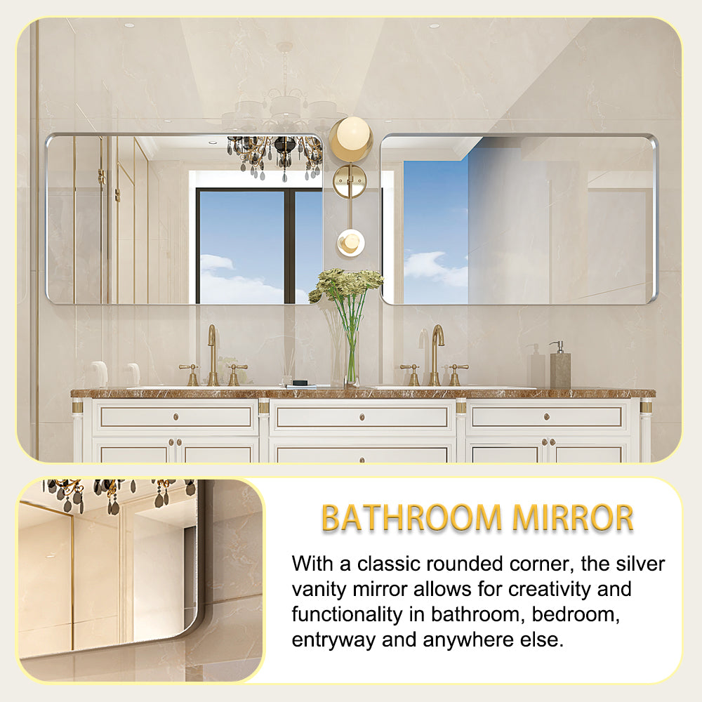 - [Glossy brushed silver metal frame mirror] : The bathroom vanity mirror uses a high-quality aluminum alloy frame, which is rust resistant and does not deform. Practical rectangular mirror with rounded corners, simple classic clean lines, with modern and industrial style.