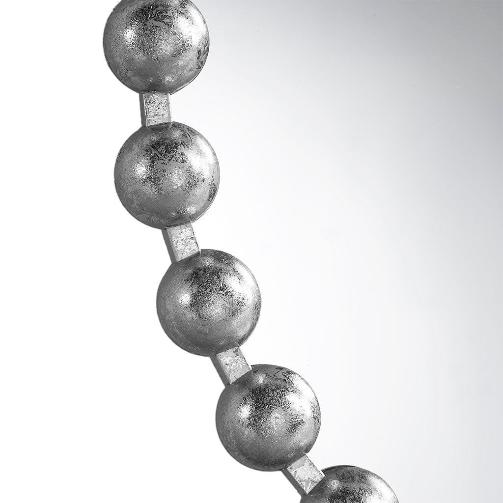 Elevate any room with this elegant beaded round wall mirror that blends modern glam with timeless craftsmanship. The antique metallic silver foil finish and stylized spherical iron frame create a luminous, textured look that enhances light and depth. Designed for easy installation and durable use, it’s a striking focal point for living rooms, entryways, bedrooms, or hallways.