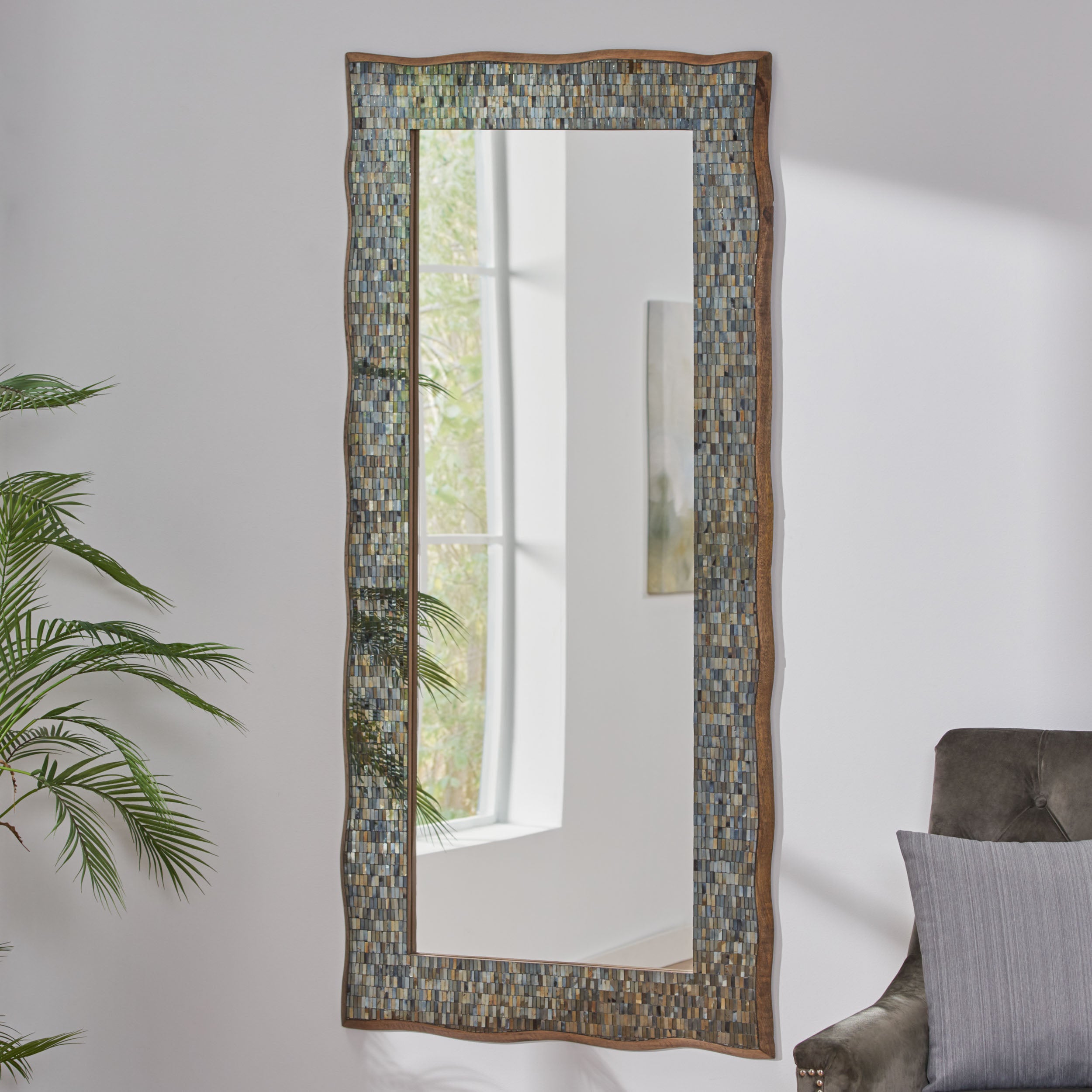 - Materials: Tempered glass mirror surface and mosaic tiles; mango wood frame with manufactured wood backing for stability.