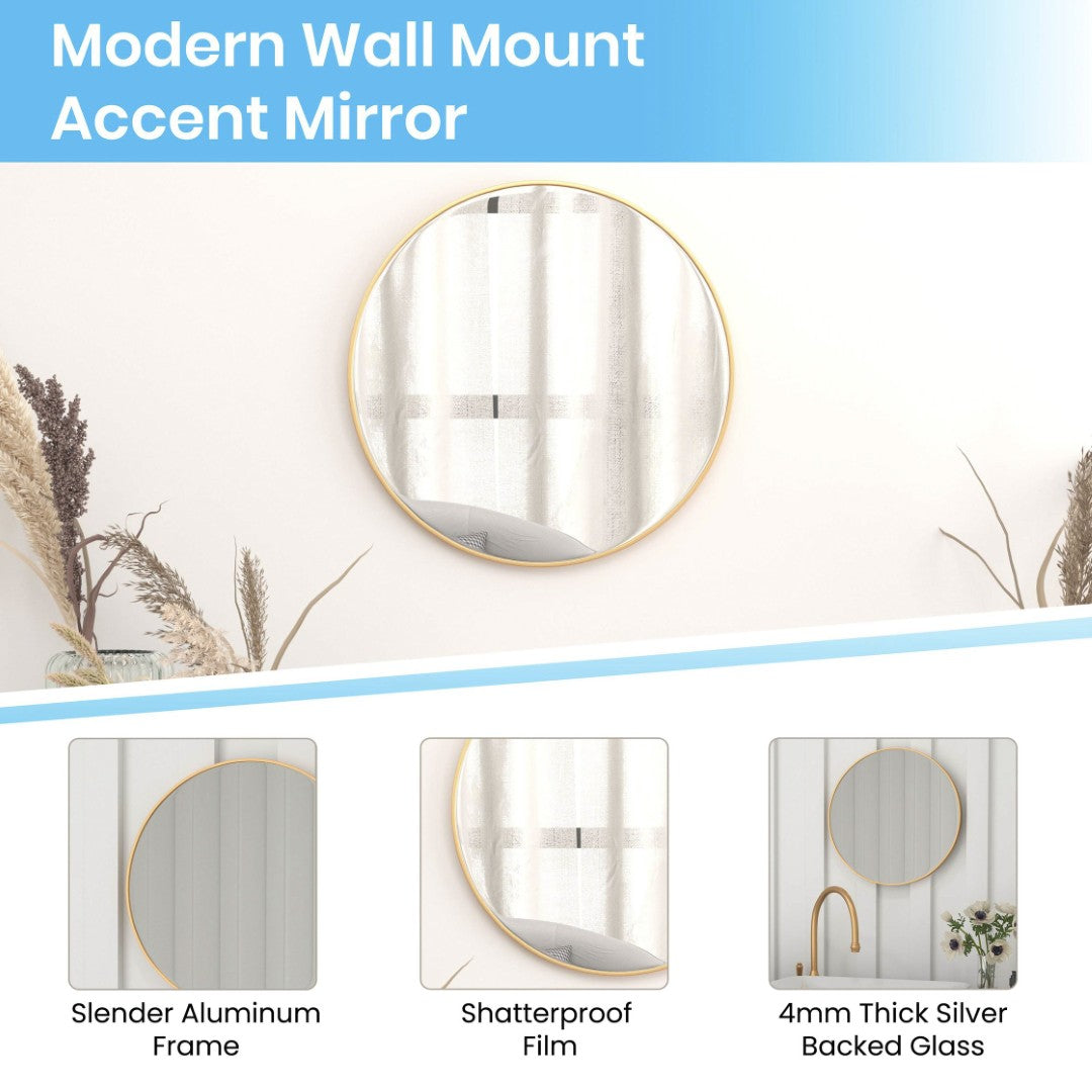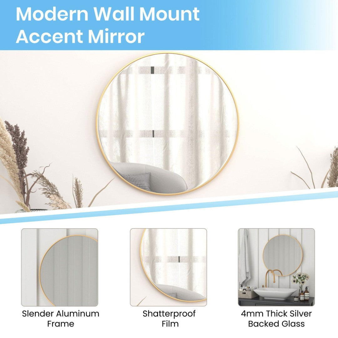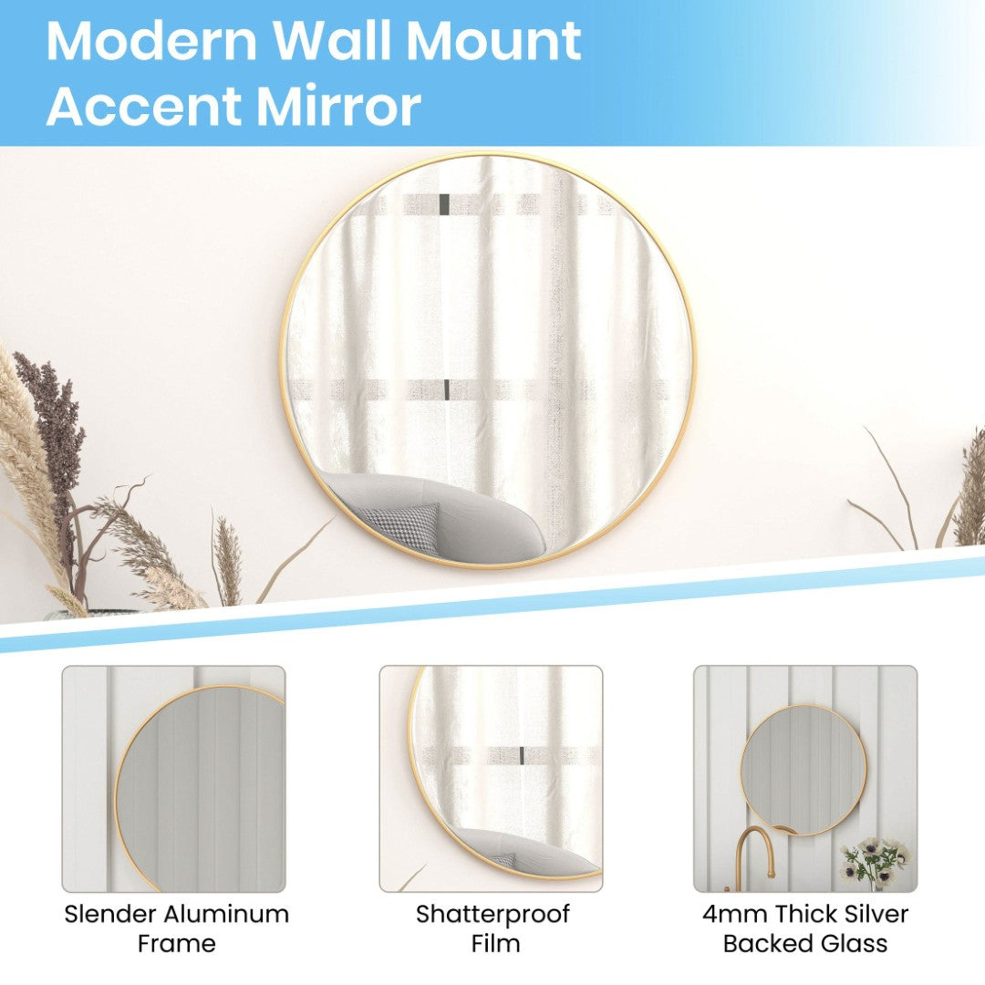 Brighten and enlarge any room with a timeless round wall mirror that blends classic elegance and practical safety. The slim oxidized gold aluminum frame offers a minimalist, aged look that complements bathrooms, vanities, entryways, dining rooms, and living spaces, while the high-reflectivity glass and shatterproof backing ensure a clear image and peace of mind in homes with children or pets.