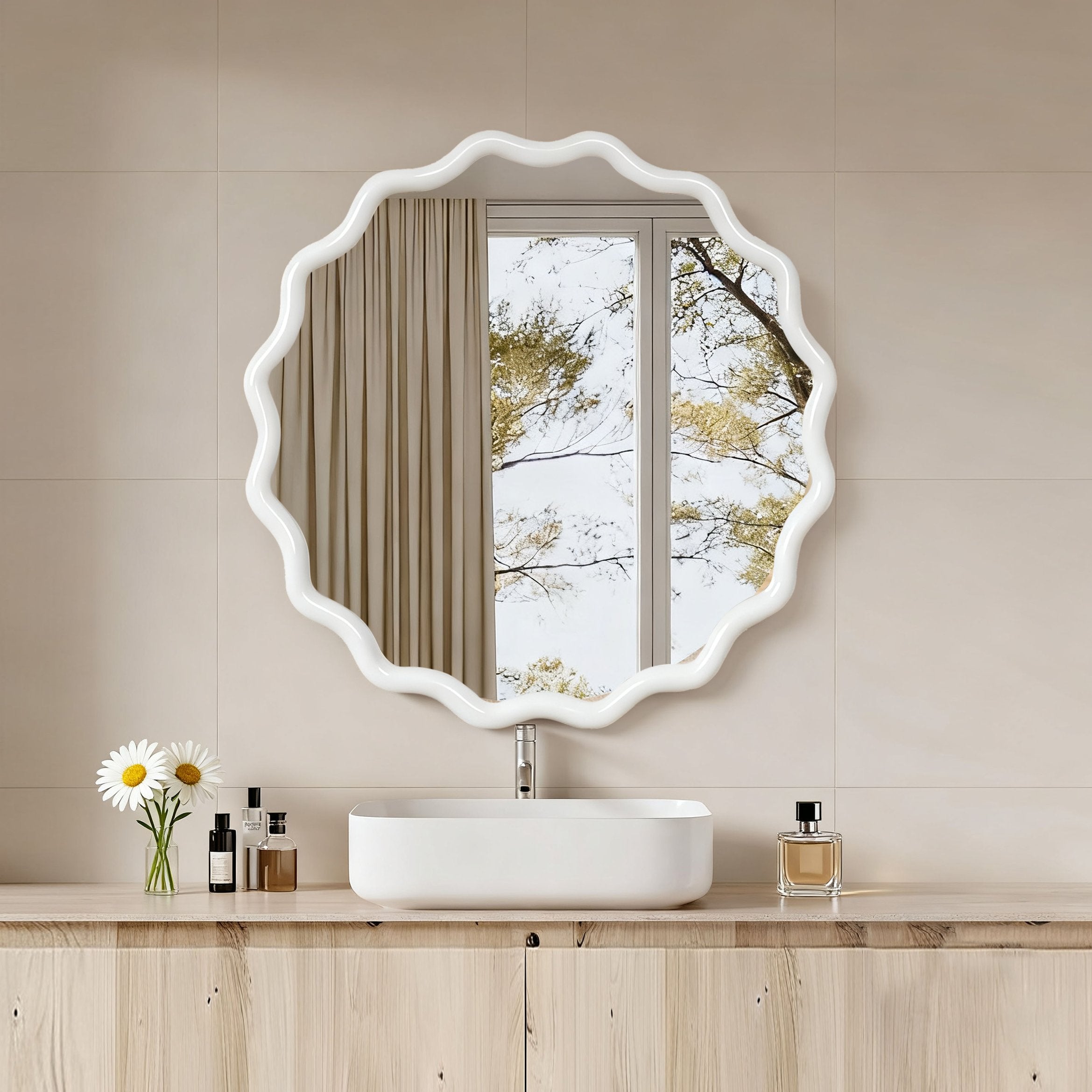 Add a sculptural focal point to your home with this wavy-round solid wood framed mirror. Its artful, irregular-edge silhouette and clean white finish bring a refined yet relaxed look that works equally well above a bathroom vanity, in a bedroom, or as an entryway statement. High-definition tempered glass provides a clear, distortion-free reflection while the sturdy solid wood frame offers lasting durability and unique natural grain variation that makes each piece one-of-a-kind.