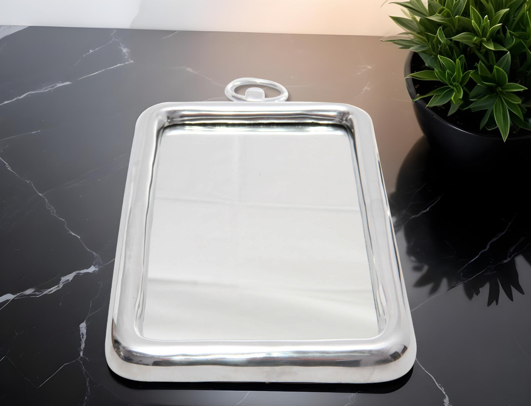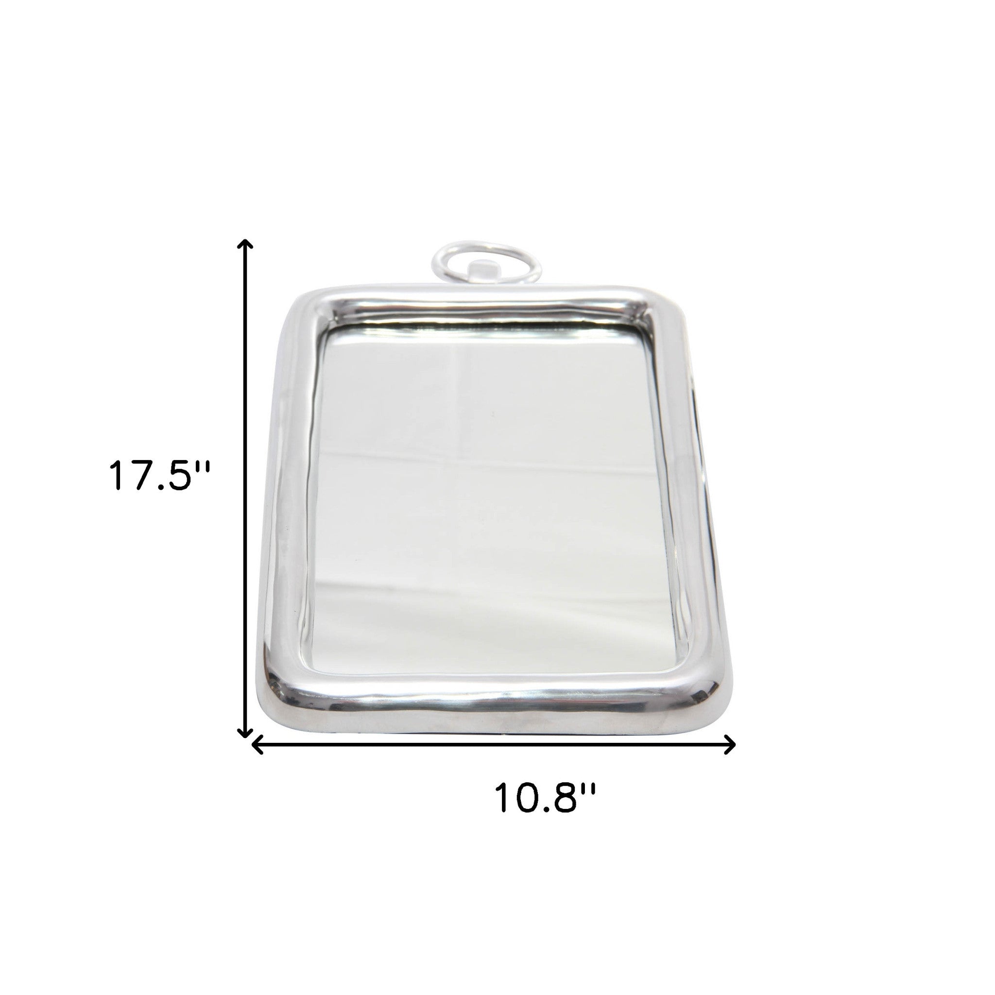 - Wall mounted aluminum frame rectangular mirror with a round ring at the top for hanging.