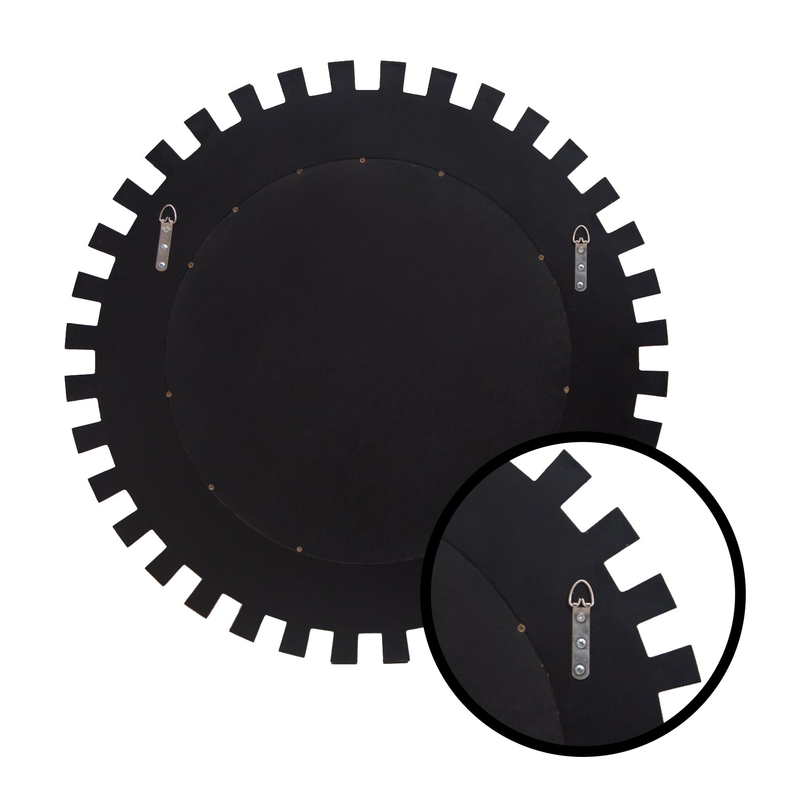 - This circular mirror features beveled glass panels and comes ready to hang with hooks on the back.