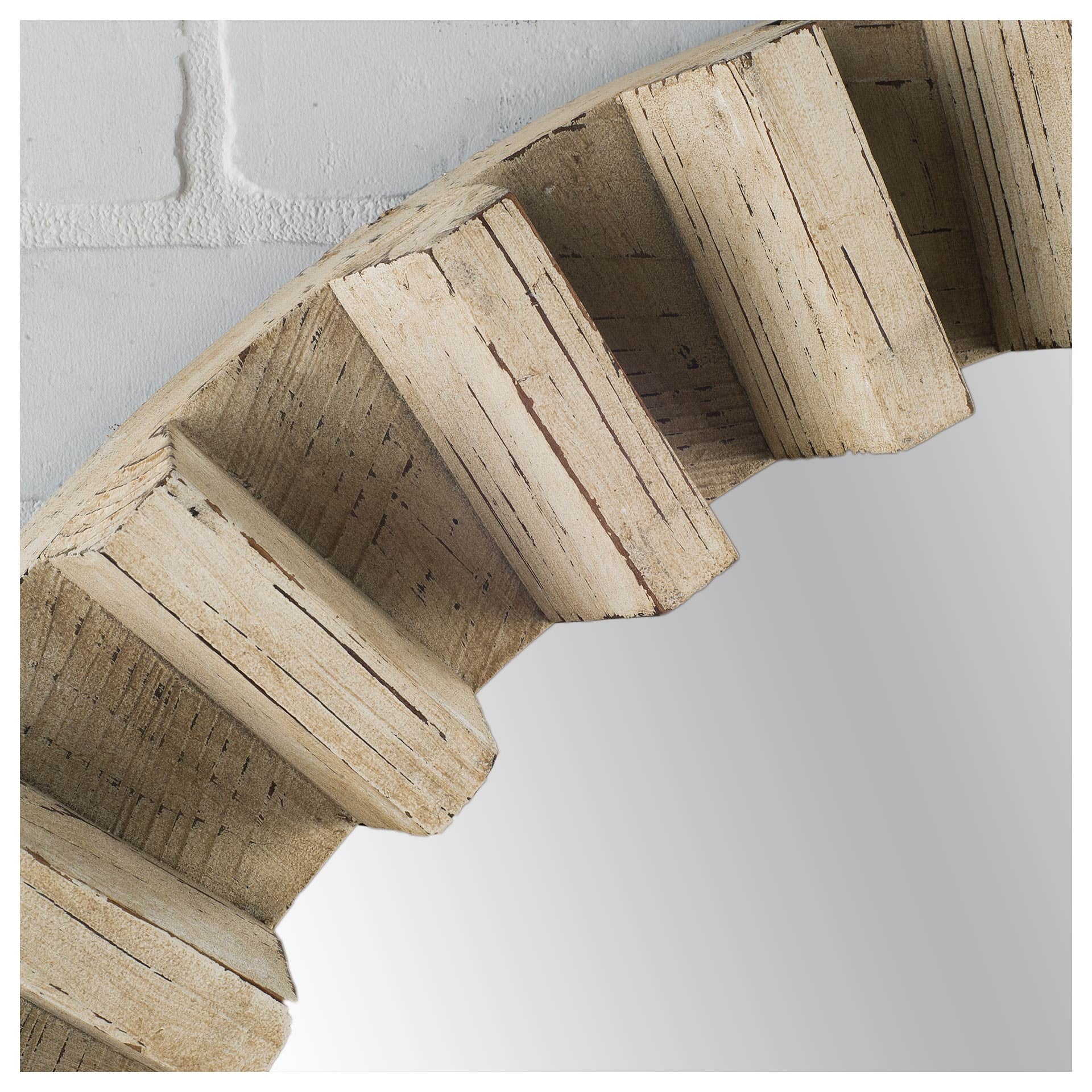 - crafted from pine wood and finished in a light brown tone, is a stunning round mirror with cog-like grooves on the frame