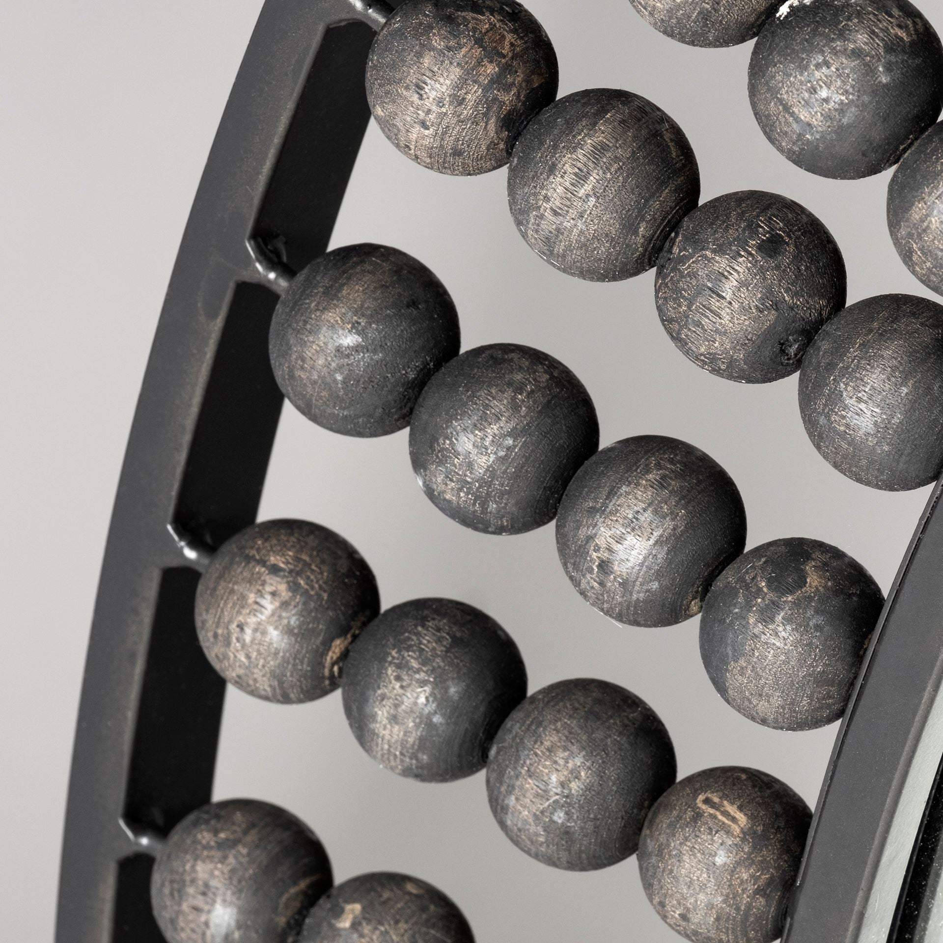 - crafted from metal and finished in a stunning, matte-black?tone, is a spectacular, double-framed round mirror with spectacular wooden bead details in a rustic black tone