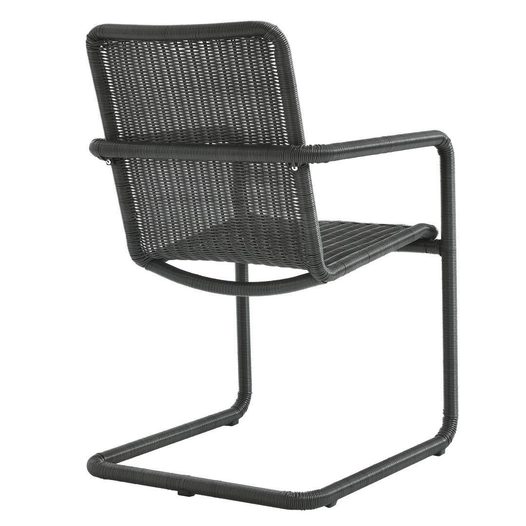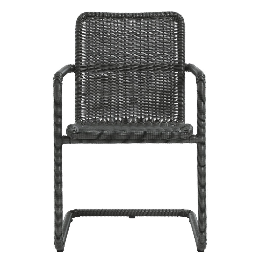 - Set of 2 Wicker Dining Armchairs Cantilevered Steel Frame Synthetic Wicker Weather-resistant and UV-protected Plastic Foot pads Assembly Required