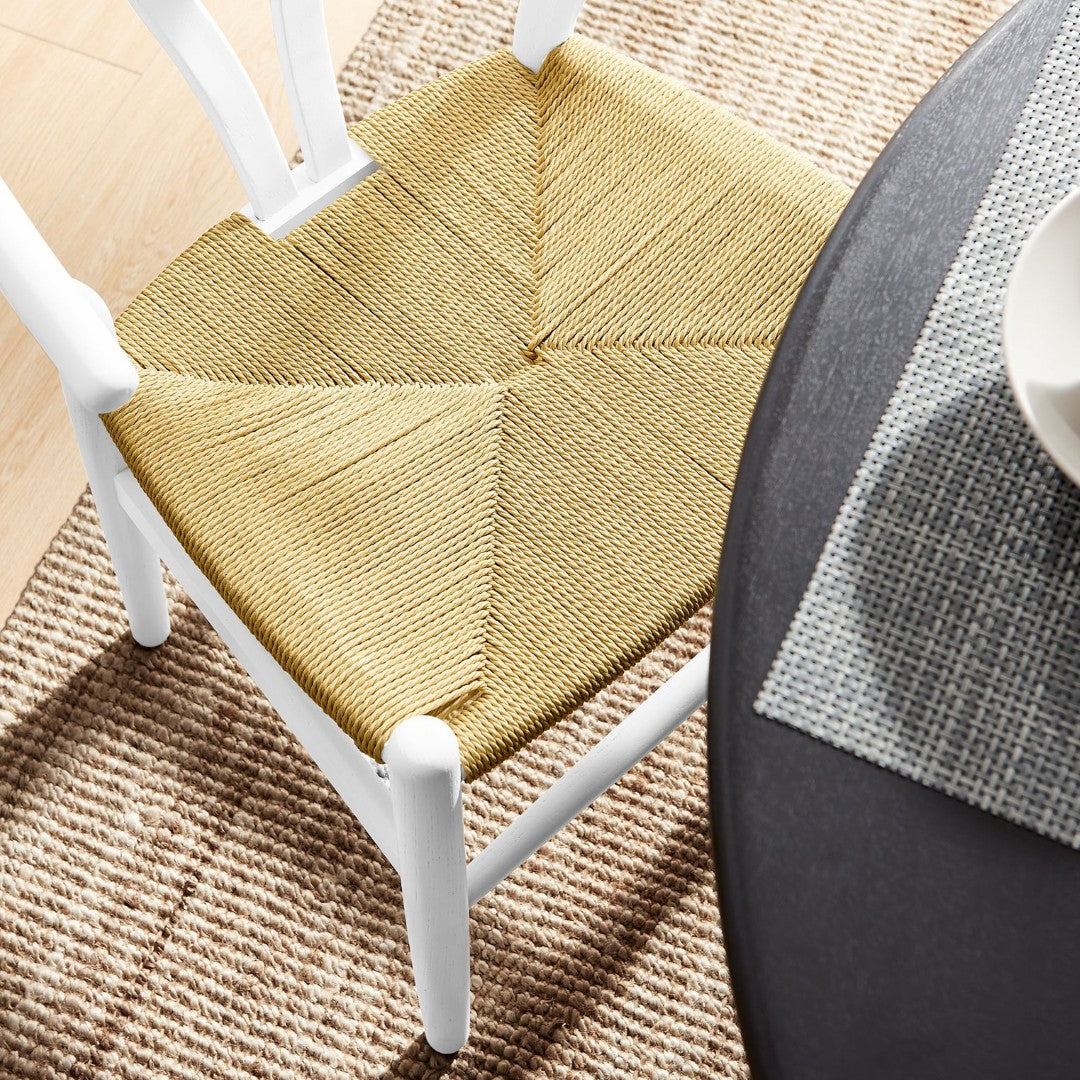 - Elm Wood Dining Chair Woven Paper Rope Seat V-Shaped Cutaway Backrest Foot Bar Supports 29" Height Non-Marking Foot Pins Arrives Fully Assembled