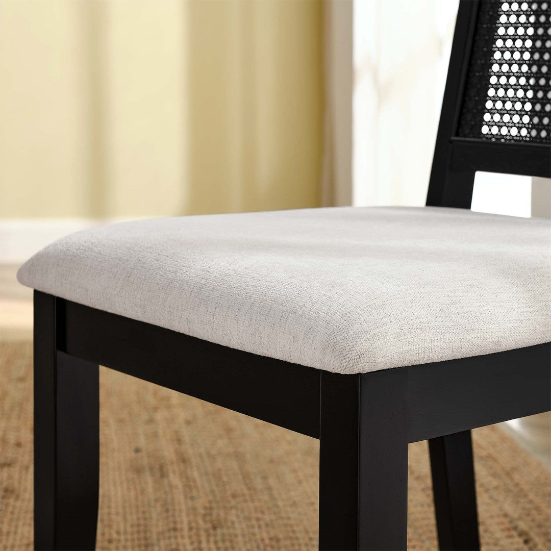 - Set of 2 Dining Chairs Solid Rubberwood Frame Heathered Weave Fabric Upholstery Faux Cane Rattan Dense Foam Padding Non-Marking Foot Glides Assembly Required