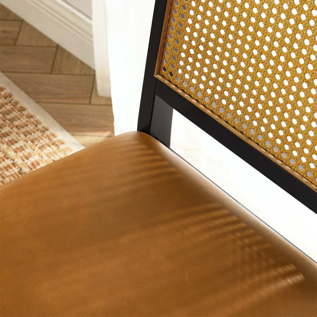 Elevate your dining space with the Arlo dining side chairs — a refined pairing of faux rattan detail and warm wood tones that blends farmhouse character with modern minimalism. Designed for everyday comfort and built to last, this set of two chairs features plush vegan leather seats, supportive cane-style backrests, and protective foot glides for worry-free use on a variety of floors.