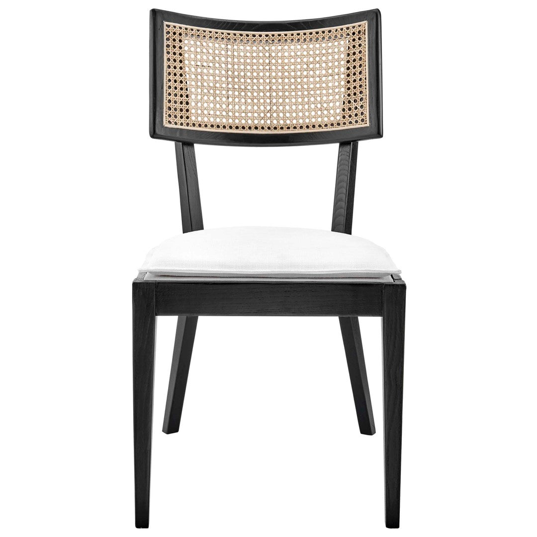 - Modern Farmhouse Dining Chairs - Set of 2 Elm Wood Frame Open Weave Rattan Backrest Fabric Upholstered Seat Includes Non-Marking Foot Caps Assembly Required Weight Capacity: 330 lbs.