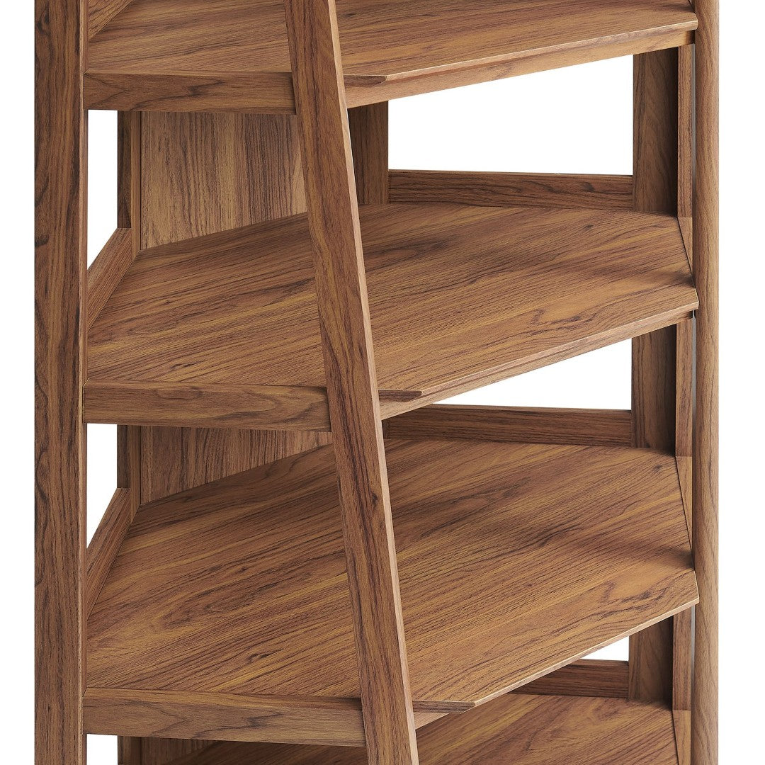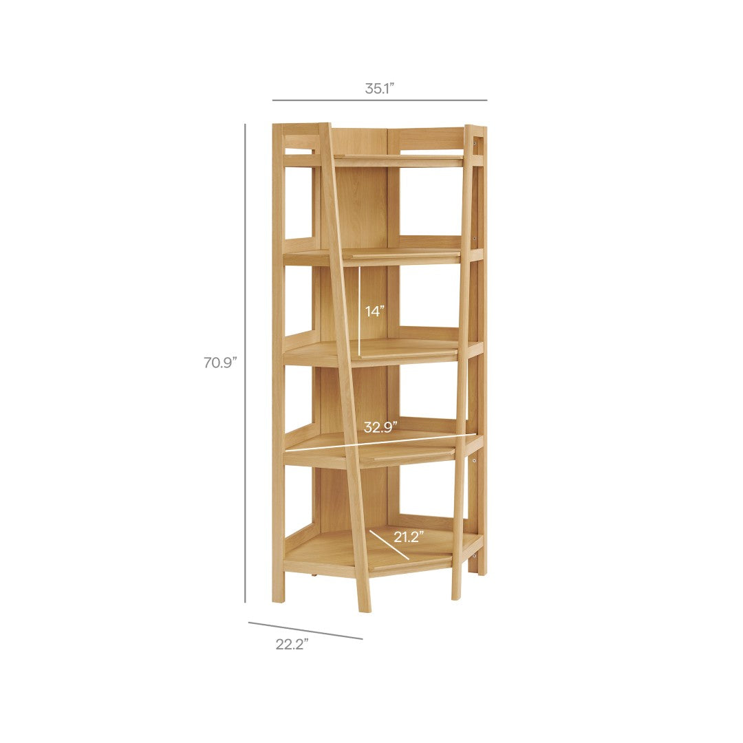- Corner Design Five Open Shelves Angled Side Supports Window-Style Panels Laminated Wood Blend Assembly Required
