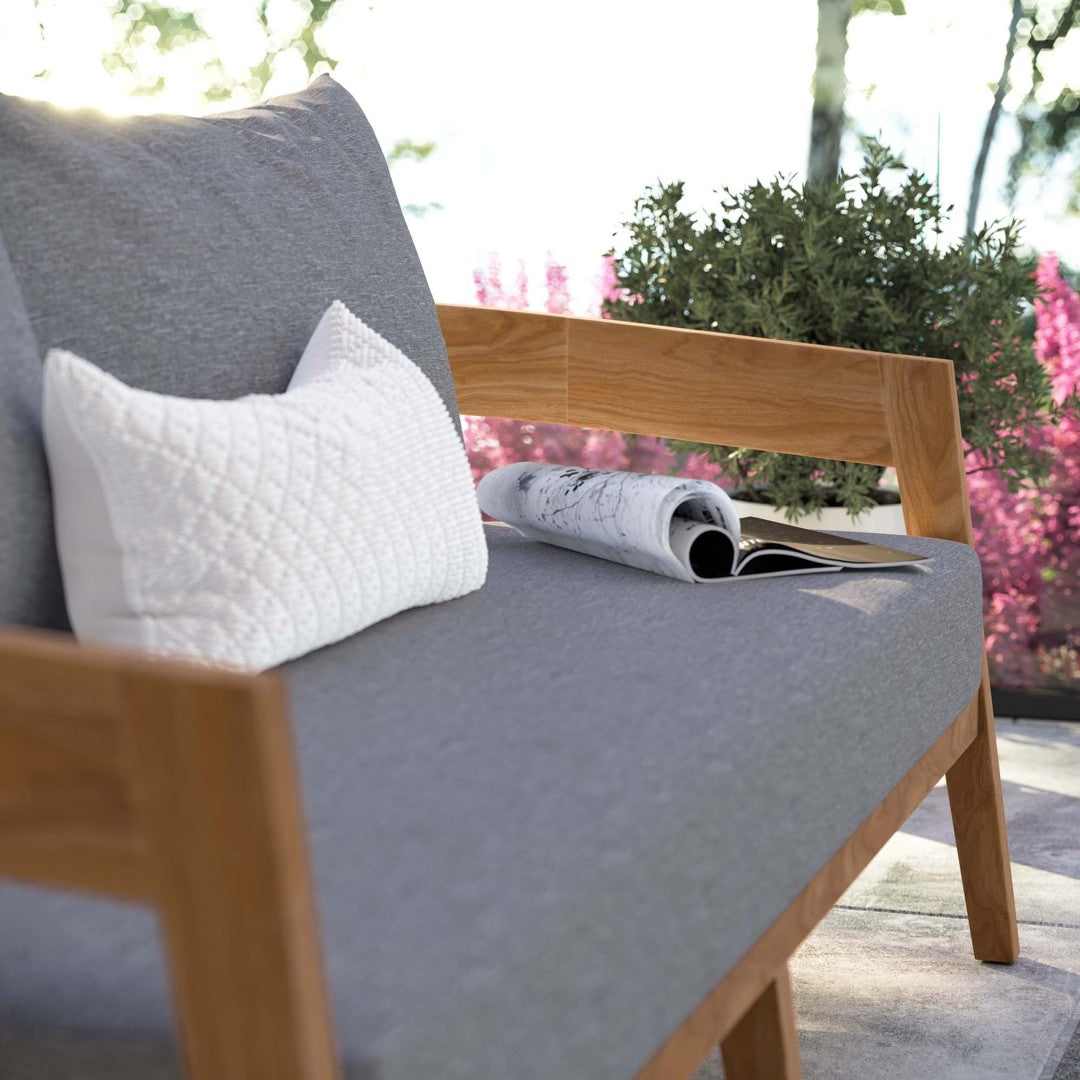 - Outdoor Patio Loveseat Grade A Premium Teak Wood All-Weather Cushions Sunproof® Fabric Cushion Covers Plastic Foot Glides Loveseat Weight Capacity: 800 lbs.