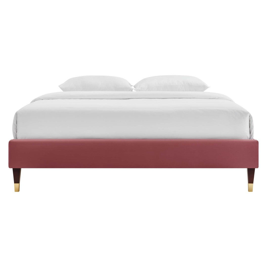 - Queen Platform Bed Stain-Resistant Performance Velvet Wood Slat Support System Reinforced Center Beam and Support Legs Wood Legs With Gold Metal Sleeves and Non-Marking Caps Assembly Required Bed Frame Weight Capacity: 800 lbs.