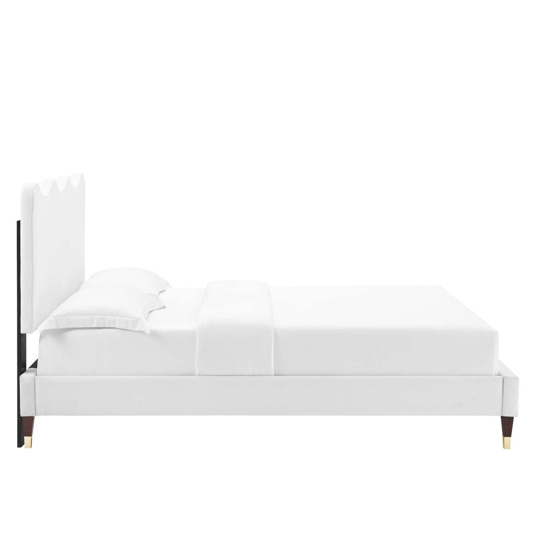 Bring coastal-inspired elegance and modern comfort to your bedroom with this scallop-silhouette platform bed, upholstered in stain-resistant performance velvet. The padded, wave-inspired headboard provides a supportive backrest for reading or lounging, while the durable slatted foundation and reinforced center beam deliver stable, long-lasting mattress support—no box spring required. Refined accents like gold-sleeved wood legs and non-marking foot caps complete the look for an elevated, contemporary statement piece.