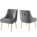 Add elegant comfort to any room with the Discern pleated-back dining chairs, offered as a set of two. These chairs combine plush performance velvet upholstery and dense foam padding with a refined pleated back and brushed gold stainless-steel legs for a look that’s both modern and timeless. Built with a solid wood-and-plywood frame and finished with a matching decorative back handle and non-marking foot caps, Discern is ideal for dining rooms, kitchens, entryways, bedrooms, home offices, or vanity seating.
