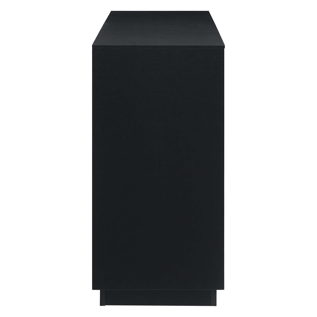- Storage configuration: Three hinged doors with interior shelving plus three full-extension drawers for organized storage of dishes, linens, media components, and accessories.
