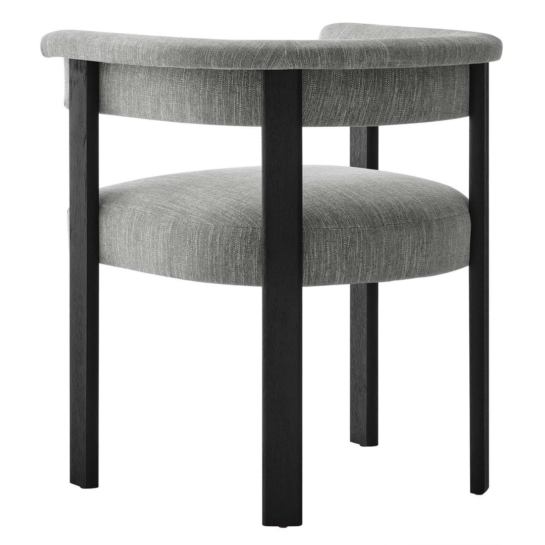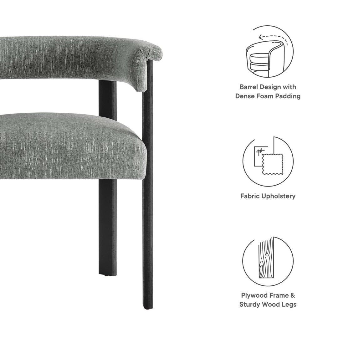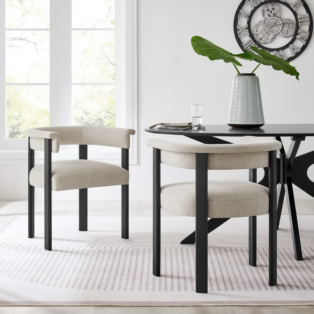 Elevate your dining space with the Imogen fabric-upholstered barrel chairs — a blend of modern sophistication and everyday comfort. The barrel silhouette and curved backrest create an embracing, lounge-like feel while maintaining a clean, contemporary profile that complements a wide range of decor styles. Built for durability and comfort, this set of two chairs pairs dense foam cushioning and quality upholstery with a sturdy plywood seat structure and solid wood legs for long-lasting use.