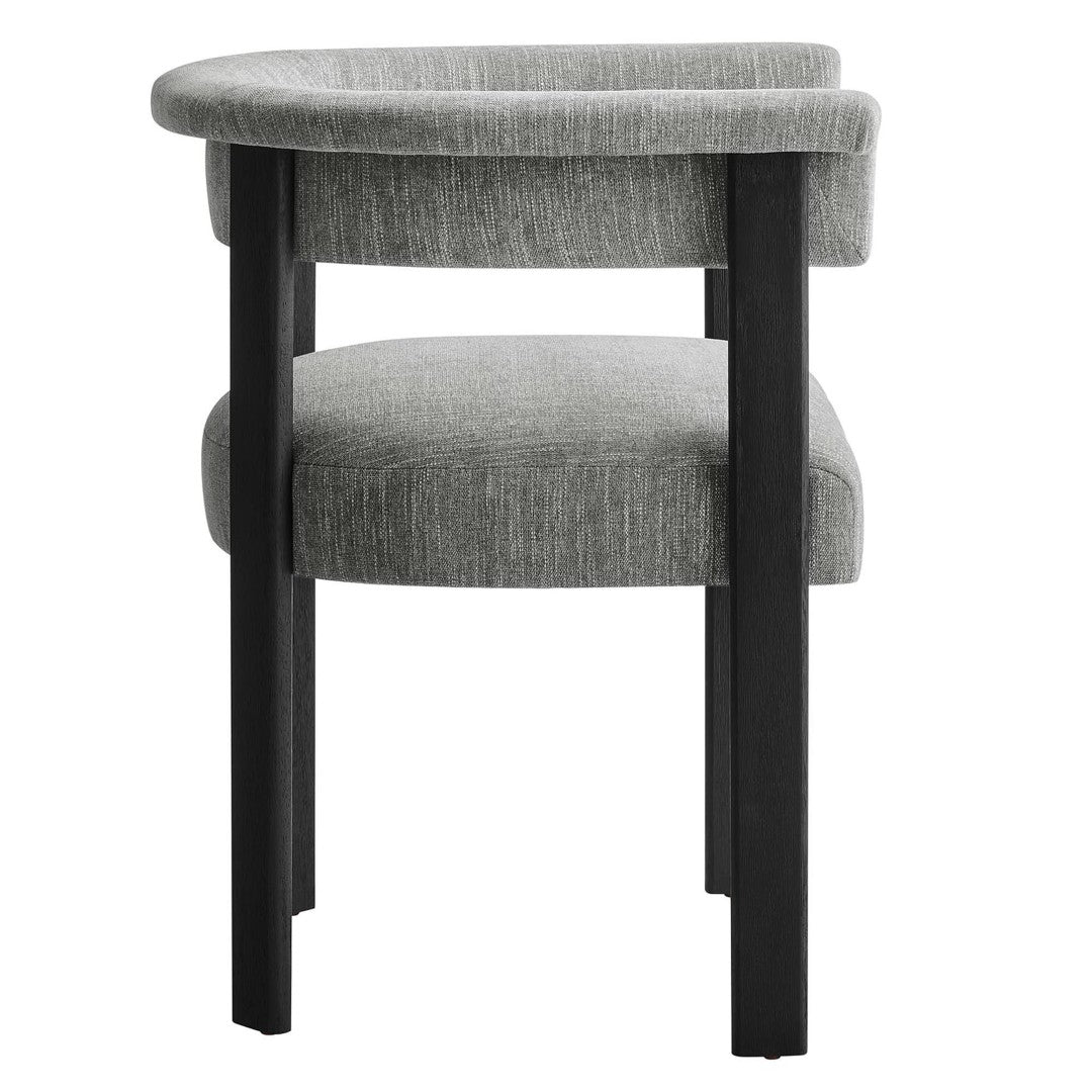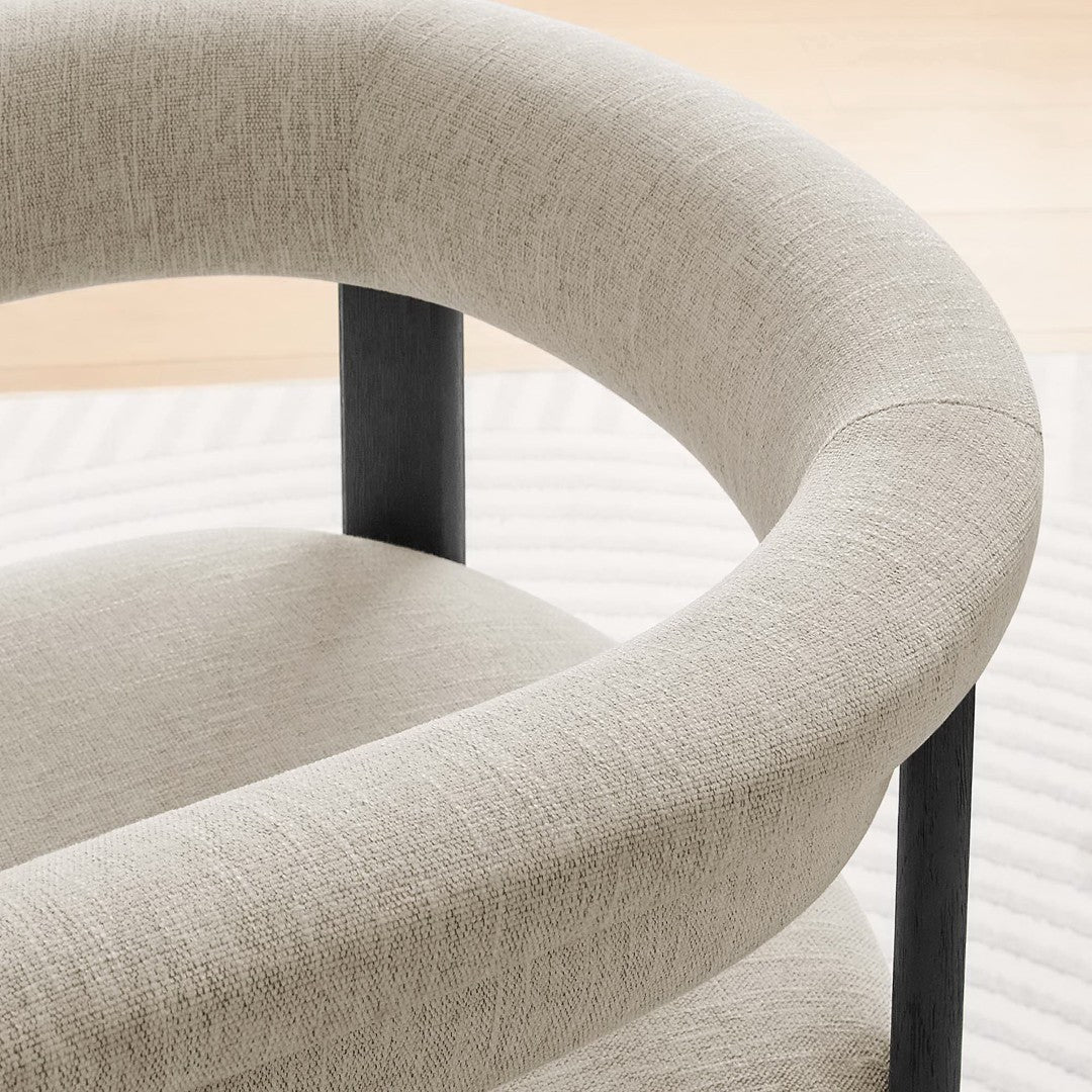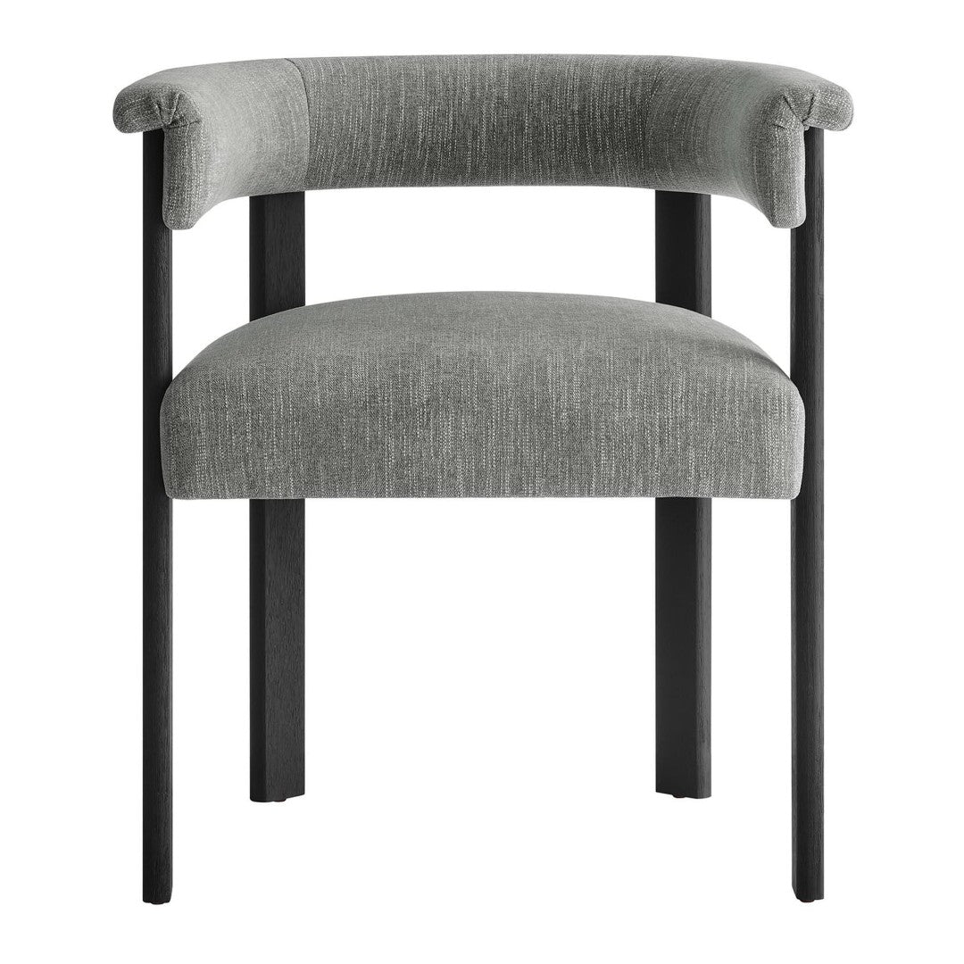 Elevate your dining space with the Imogen fabric-upholstered barrel chairs — a blend of modern sophistication and everyday comfort. The barrel silhouette and curved backrest create an embracing, lounge-like feel while maintaining a clean, contemporary profile that complements a wide range of decor styles. Built for durability and comfort, this set of two chairs pairs dense foam cushioning and quality upholstery with a sturdy plywood seat structure and solid wood legs for long-lasting use.