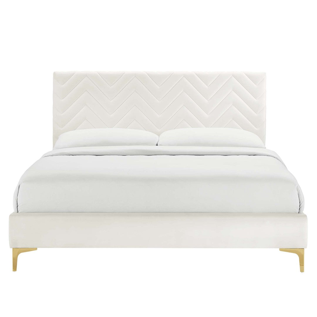 Introduce modern glam to your bedroom with the Leah Chevron Tufted Performance Velvet Full Platform Bed — a chic, durable foundation that blends Art Deco-inspired styling with practical engineering for everyday comfort and support. The striking chevron tufted headboard and plush, stain-resistant performance velvet upholstery create a luxe focal point, while a reinforced slat system and metal legs provide lasting stability for a variety of mattress types.