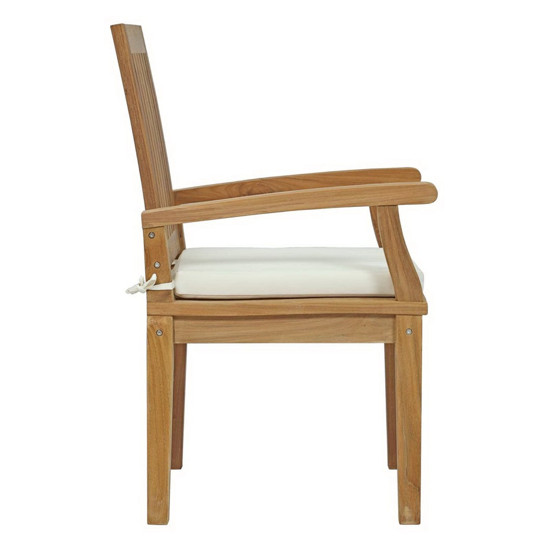 - Outdoor teak dining armchair/table Solid teak wood construction Richly textured wood grain Water and UV resistant cushion Machine washable cover Vertical seat slats Assembly required