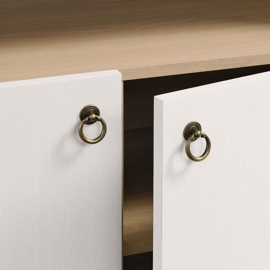 - Hardware & features: Soft-close hinges and metal ring pull handles in a brushed gold finish for smooth, elegant operation.