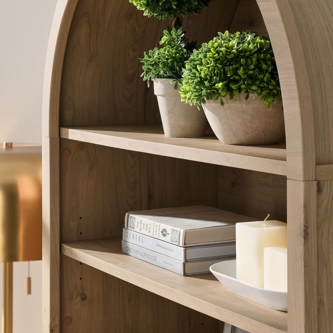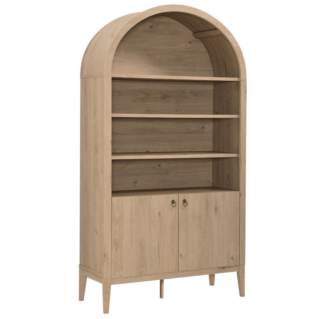 Bring classic farmhouse charm and smart storage to any room with this tall, wide arched display cabinet. Designed to showcase decor while concealing clutter, its graceful arched top, wood-grain laminate finish, and tapered legs create an elevated, vintage-inspired silhouette that fits living rooms, hallways, and dining areas.
