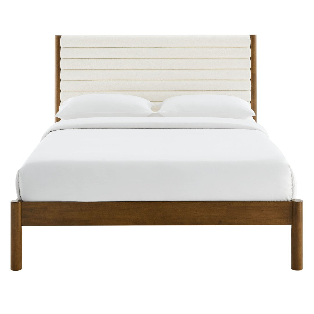 Create a calm, stylish focal point for your bedroom with the Olea Boucle Platform Bed. Thoughtfully designed with clean contemporary lines and plush upholstery, this queen-size frame pairs the tactile richness of boucle fabric with a solid rubberwood structure for lasting comfort and stability. Channel tufting on the padded headboard adds visual depth while the rounded pillar-style legs and minimalist curves introduce a warm, mid-century modern influence—perfect for a master suite or a welcoming guest room. The platform design eliminates the need for a box spring and supports a variety of mattress types for immediate, hassle-free use.