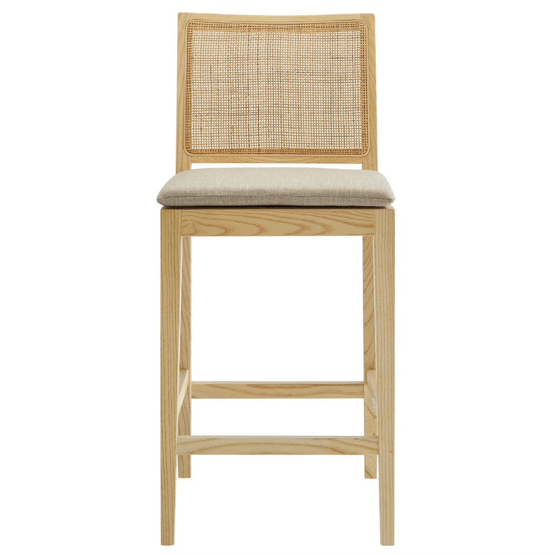 - Armless Counter Stool Elm Wood Frame Woven Rattan Backrest Removable Padded Cushion Fabric Upholstery Non-Marking Floor Pins Fully Assembled