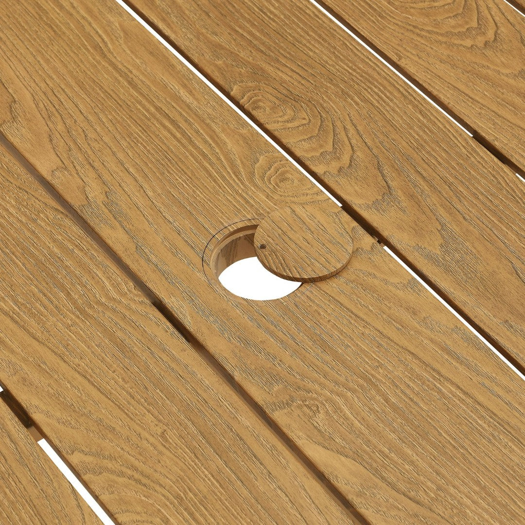 Elevate your outdoor dining area with a refined combination of modern design and durable construction. The Parkland aluminum dining table brings a warm wood-grain aesthetic to weather-resistant metal, creating a sophisticated focal point for gatherings of up to six. Thoughtfully engineered for convenience and longevity, this table includes features that protect flooring, accommodate an umbrella, and require minimal assembly—ideal for everyday use or entertaining.