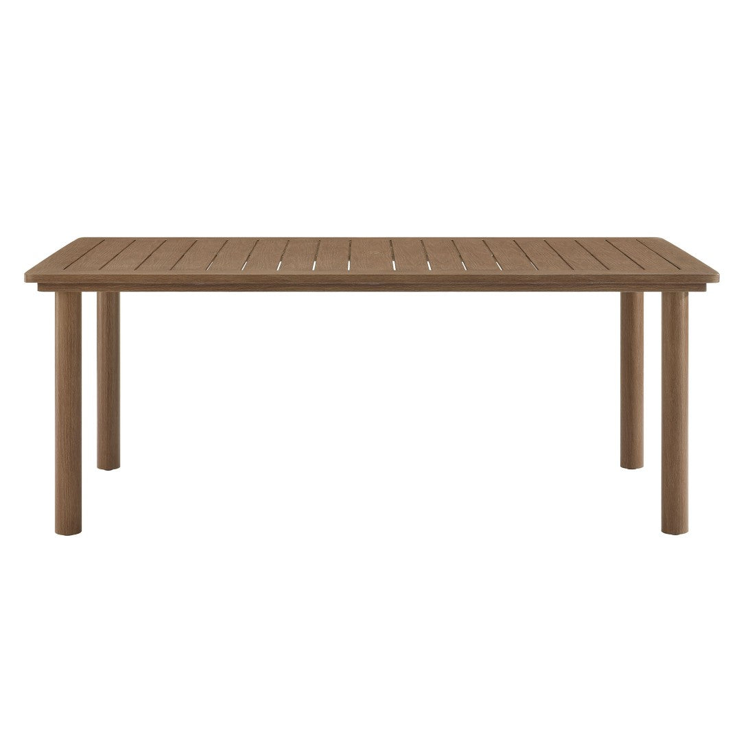 - Rectangular Dining Table Slatted Tabletop Aluminum Frame with Wood Finish All-Weather Design Adjustable Floor Glides Assembly Required