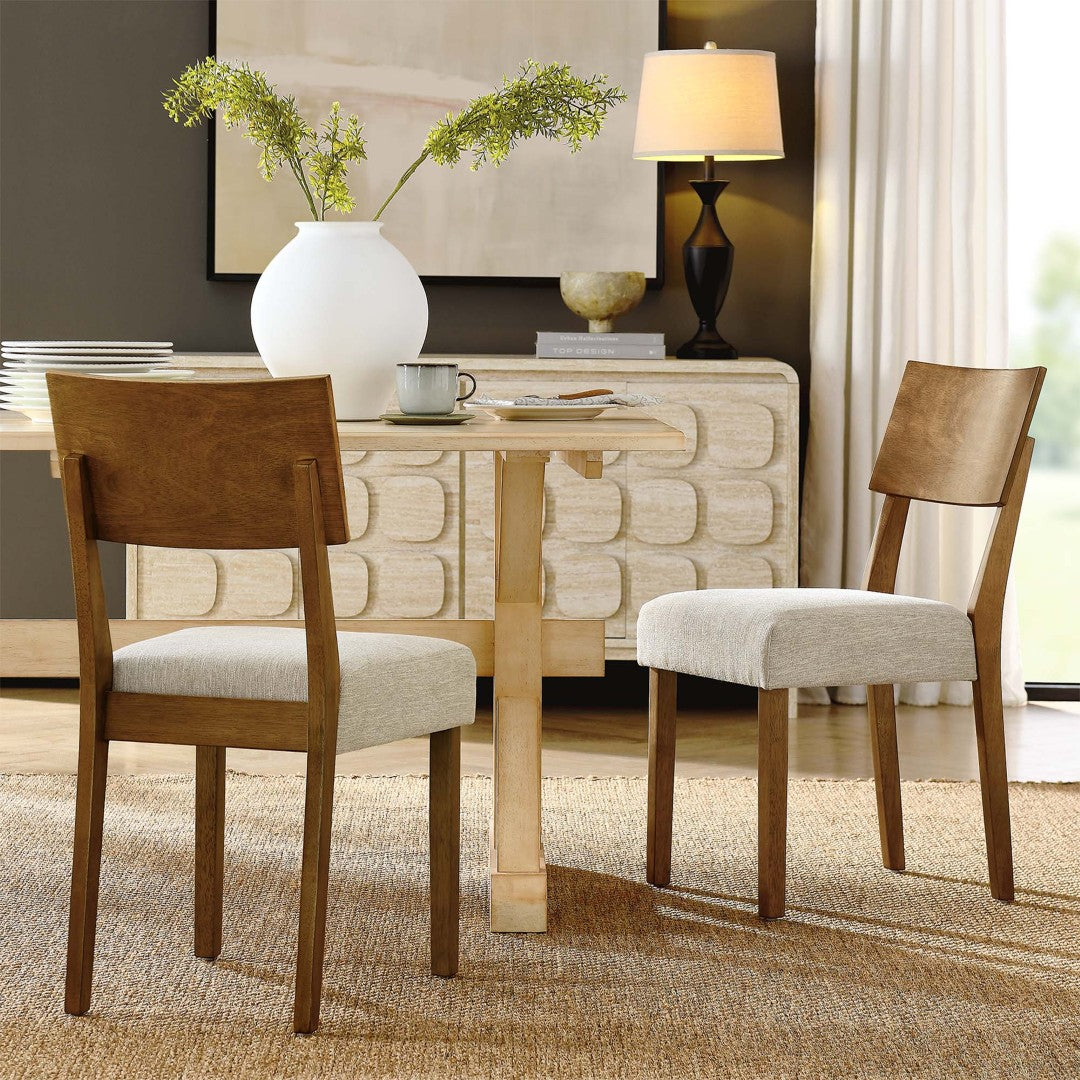 Bring mid-century modern charm and everyday comfort to your dining or living space with this set of two Pax wood side chairs. Thoughtfully designed for style and durability, these armless upholstered chairs combine a solid wood frame, plush dense-foam cushioning, and a heathered weave fabric for an inviting look and comfortable seating that complements a range of interiors—from farmhouse to contemporary. Non-marking foot glides protect floors, and the clean silhouette makes them easy to pair with most dining tables or use as standout accent chairs. Assembly required.