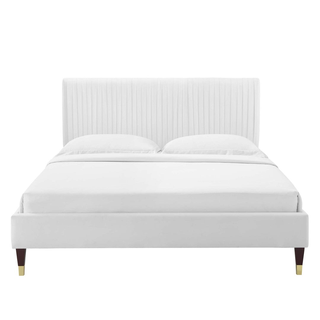 - Channel Tufted Queen Platform Bed Stain-Resistant Performance Velvet Wood Slat Support System Reinforced Center Beam and Support Legs Wood Legs With Gold Metal Sleeves and Non-Marking Caps Assembly Required Weight Capacity: 800 lbs.