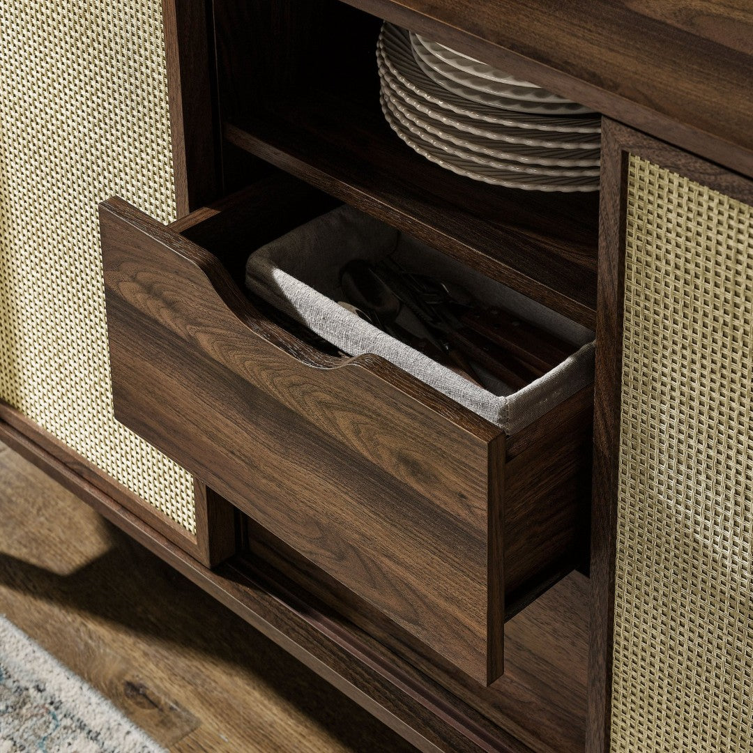 - 63" Curved Sideboard Laminate Finish Synthetic Rattan Sliding Doors 2 Drawers Open and Closed Shelving Assembly Required