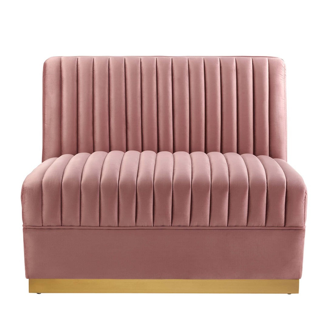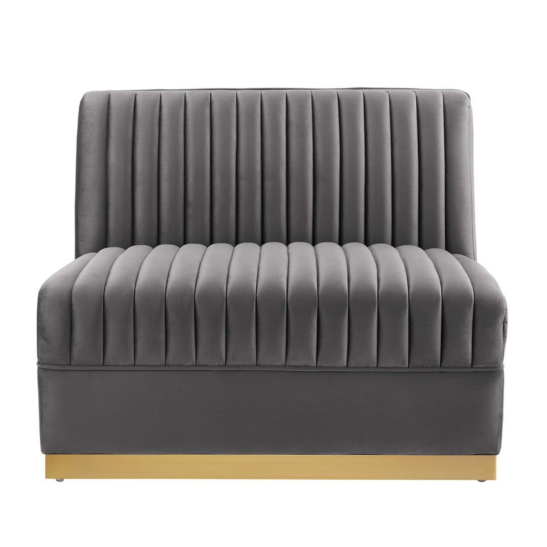 Bring retro-modern glamour to your space with the Sanguine Channel Tufted Performance Velvet modular armless chair. Its vertical channel tufting and luxe, stain-resistant performance velvet create a sophisticated focal point while dense foam and individually wrapped coils deliver plush, supportive comfort. Built on a durable eucalyptus and plywood frame with a chic gold stainless steel base, this modular piece combines style, function, and lasting construction — ideal for living rooms, lounges, and contemporary apartments.