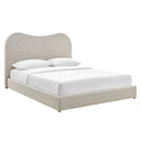 - Queen Size Platform Bed Curved Padded Headboard Soft Textured Boucle Upholstery Wood Slat Support System No Box Spring Required Durable Low Profile Plastic Legs Assembly Required