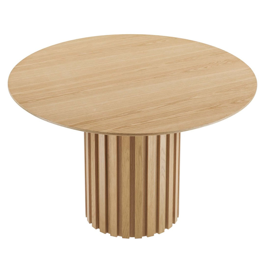 Elevate your dining area with the Senja round dining table — a refined centerpiece that blends mid-century motifs with modern practicality. Thoughtfully crafted for everyday meals and entertaining, its fluted pedestal base and natural wood-grain veneer add visual warmth while maintaining a compact footprint ideal for homes and apartments.