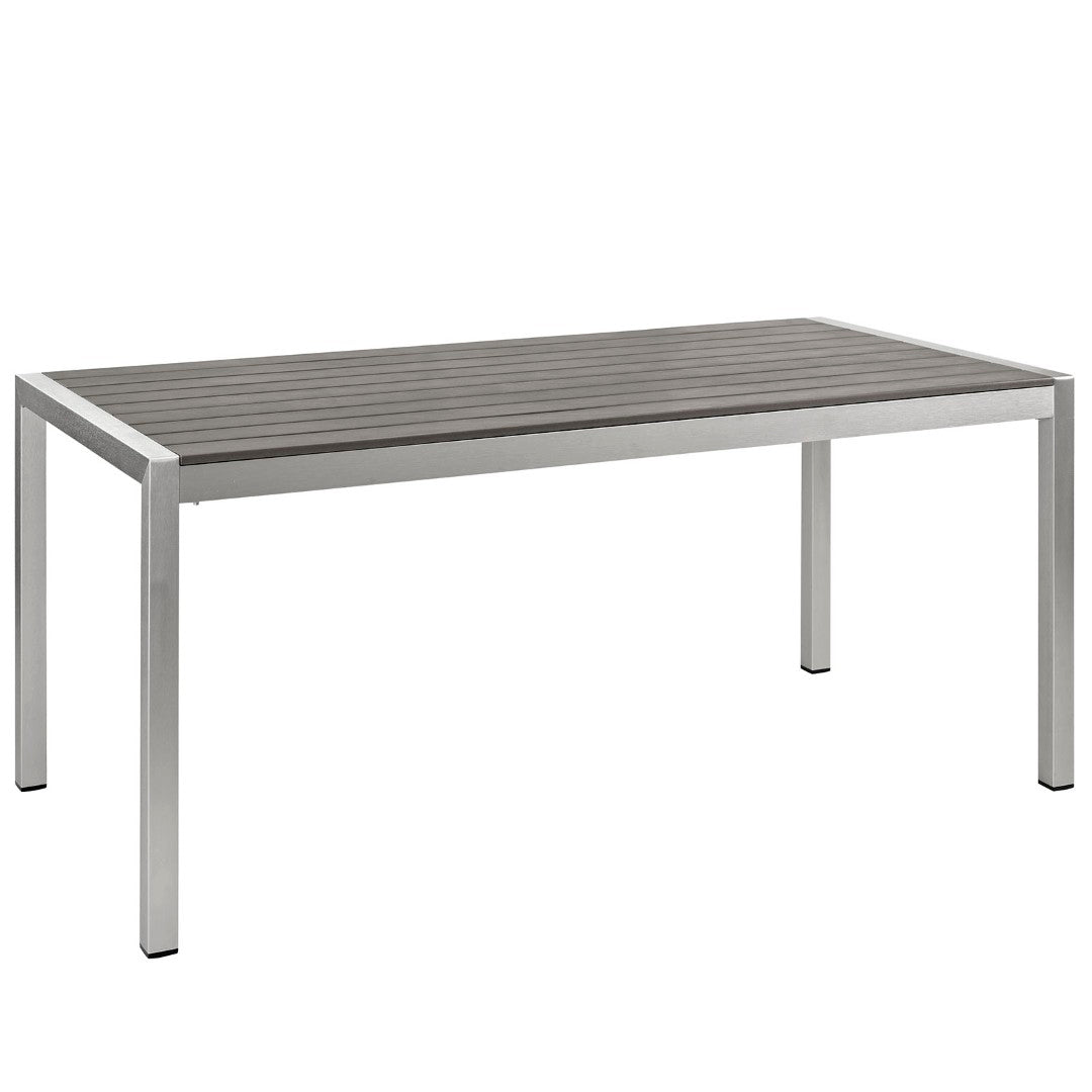 Bring modern coastal style and durable construction to your outdoor dining area with this 5-piece Shore patio set. Designed for everyday alfresco use, the set pairs a spacious anodized brushed aluminum table with four comfortable chairs featuring wood-effect paneling and molded arm pads. Weather-resistant materials, non-marking foot caps, and a minimalist gray palette create a low-maintenance, cohesive look that suits patios, decks, and backyard entertaining.