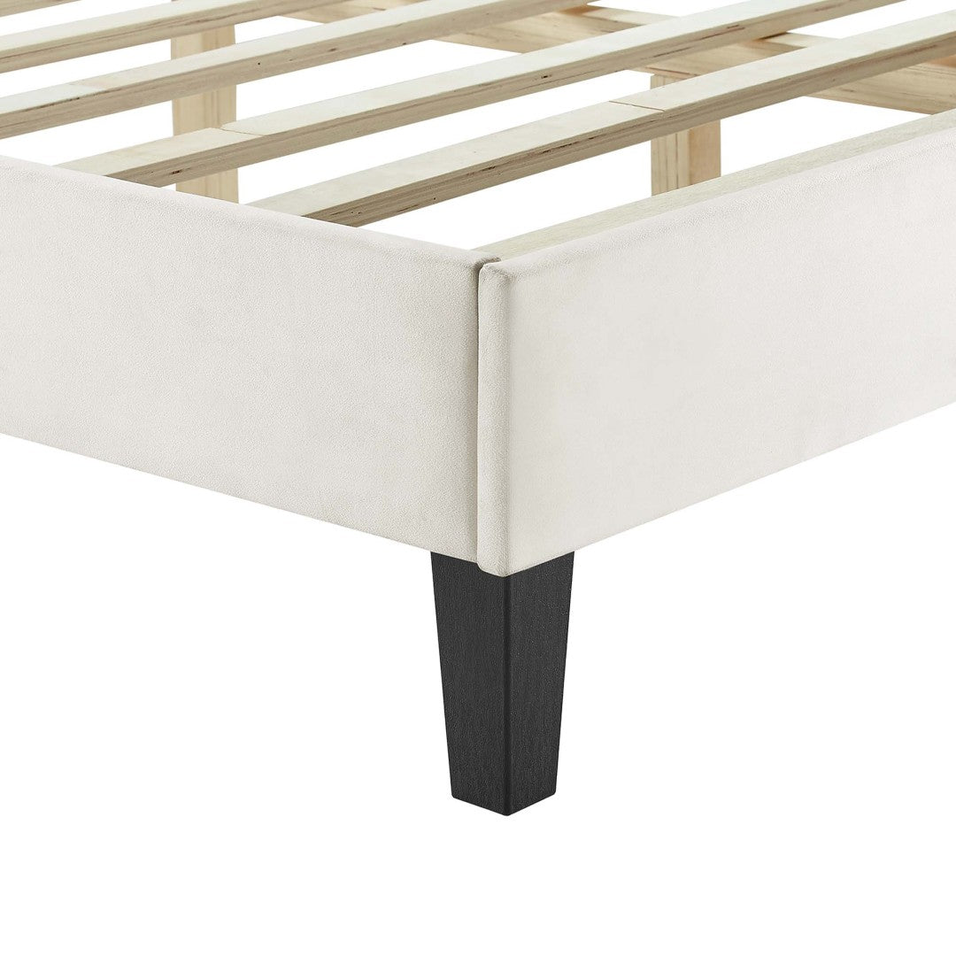 - Queen Platform Bed Stain-Resistant Performance Velvet Wood Slat Support System Reinforced Center Beam Tapered Black Wood Legs Assembly Required Bed Weight Capacity: 800 lbs