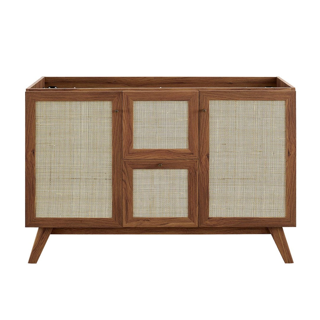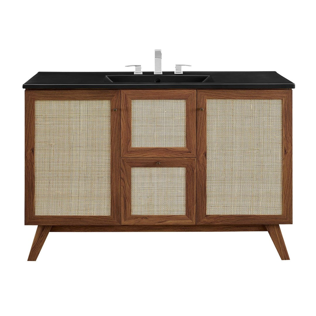 Refresh your bathroom with the Soma 48" single-sink vanity — a balanced blend of organic texture and contemporary function. The rattan-weave cabinet doors and drawer fronts introduce natural warmth, while the integrated ceramic sink and soft-close hardware ensure modern convenience. Thoughtful storage, adjustable shelving, and a resilient wood-grain finish make this vanity a practical focal point for powder rooms and full baths alike.