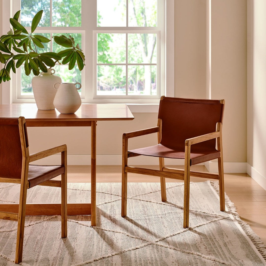 Bring a warm, sculptural focal point to dining rooms, studies, or entryways with the Sonora Leather Dining Chair. Its refined silhouette pairs smooth leather upholstery with a solid teak frame, creating a versatile piece that balances modern minimalism and enduring craftsmanship. Thoughtfully contoured for everyday comfort, the Sonora is ideal for meals, meetings, or occasional seating and arrives fully assembled for immediate use.
