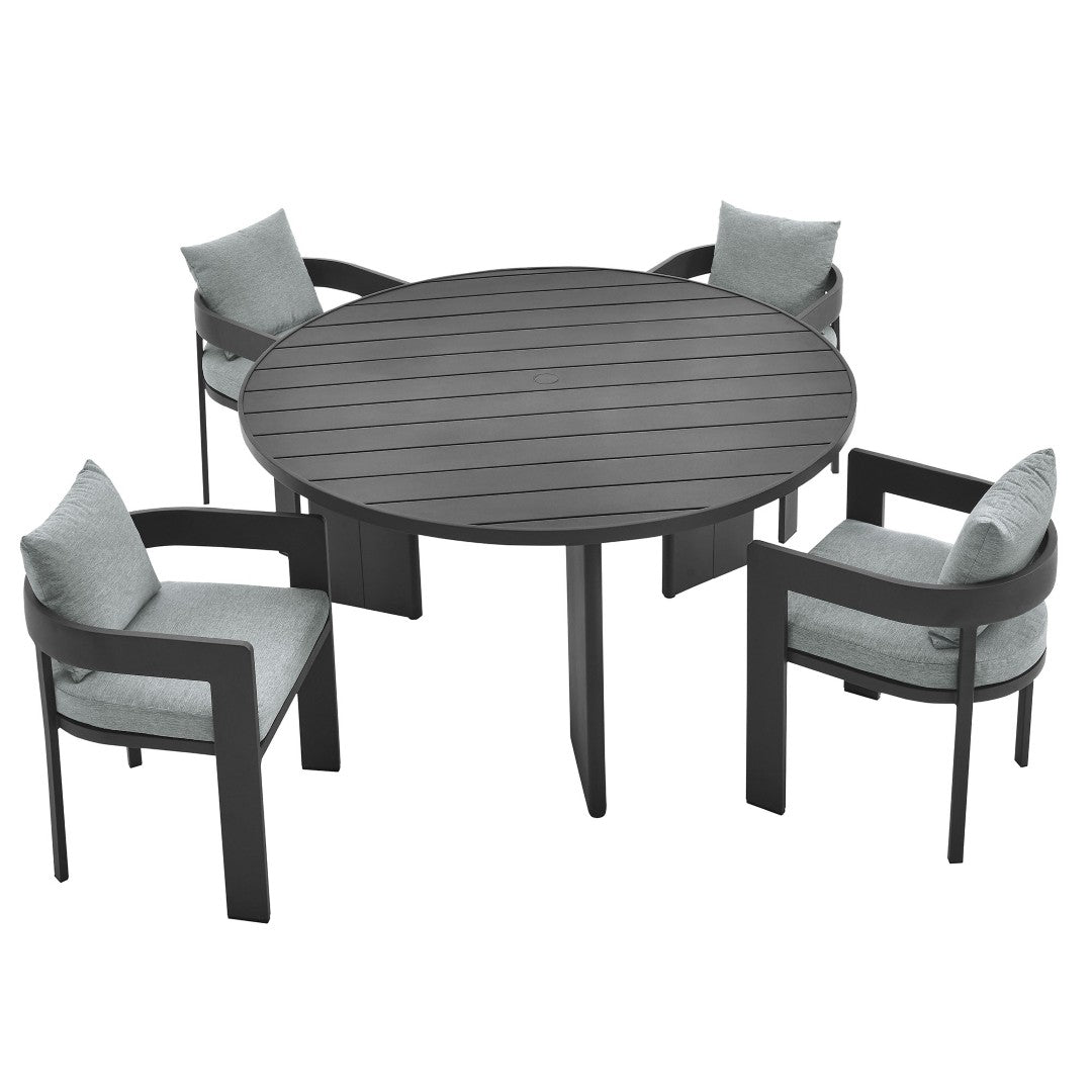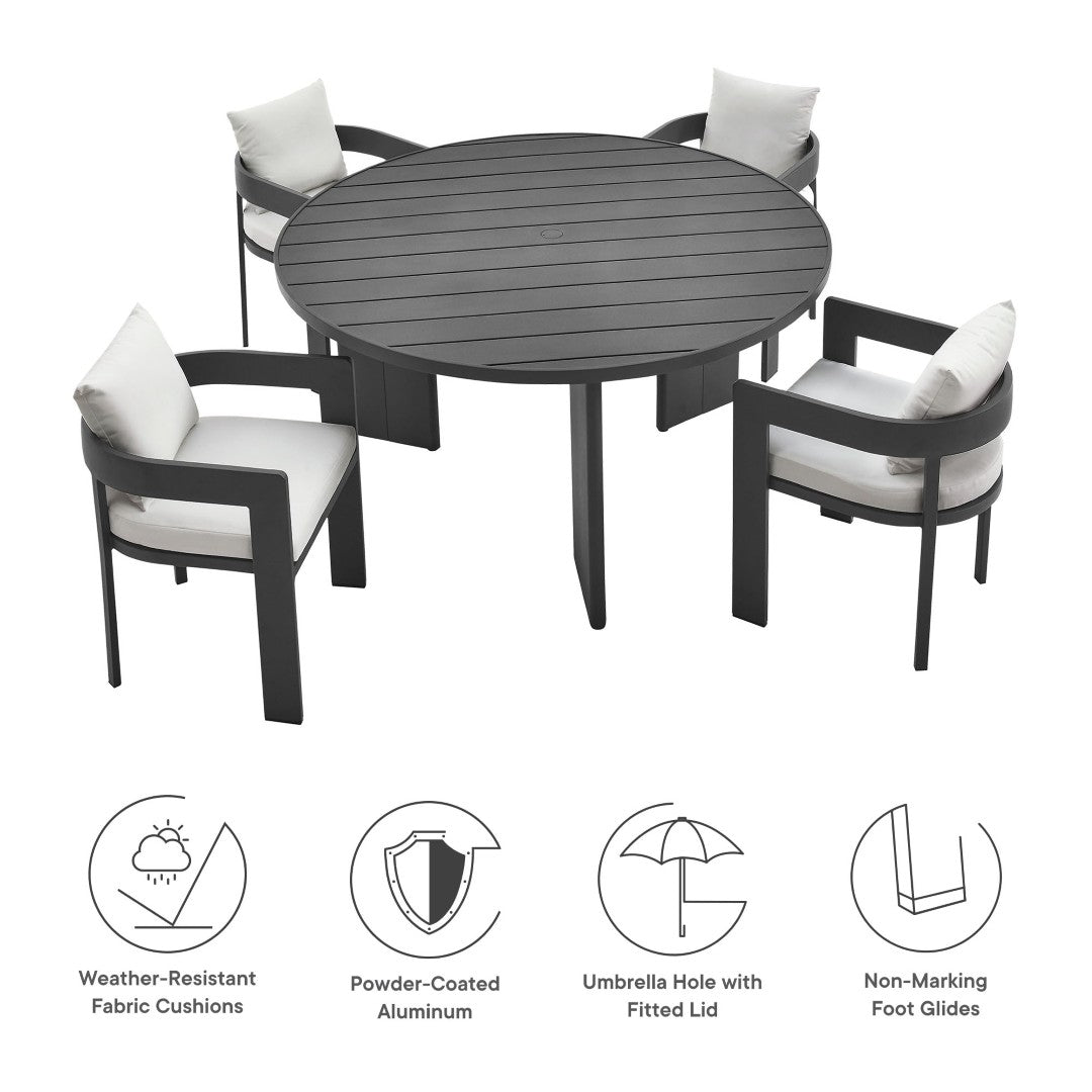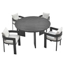 Bring modern comfort and durable style to your outdoor dining area with this 5-piece aluminum patio set. Thoughtfully designed for everyday use and easy care, the set pairs a spacious round table with four supportive chairs that include removable, weather-ready cushions—perfect for casual meals, entertaining, or relaxing on the deck or patio.