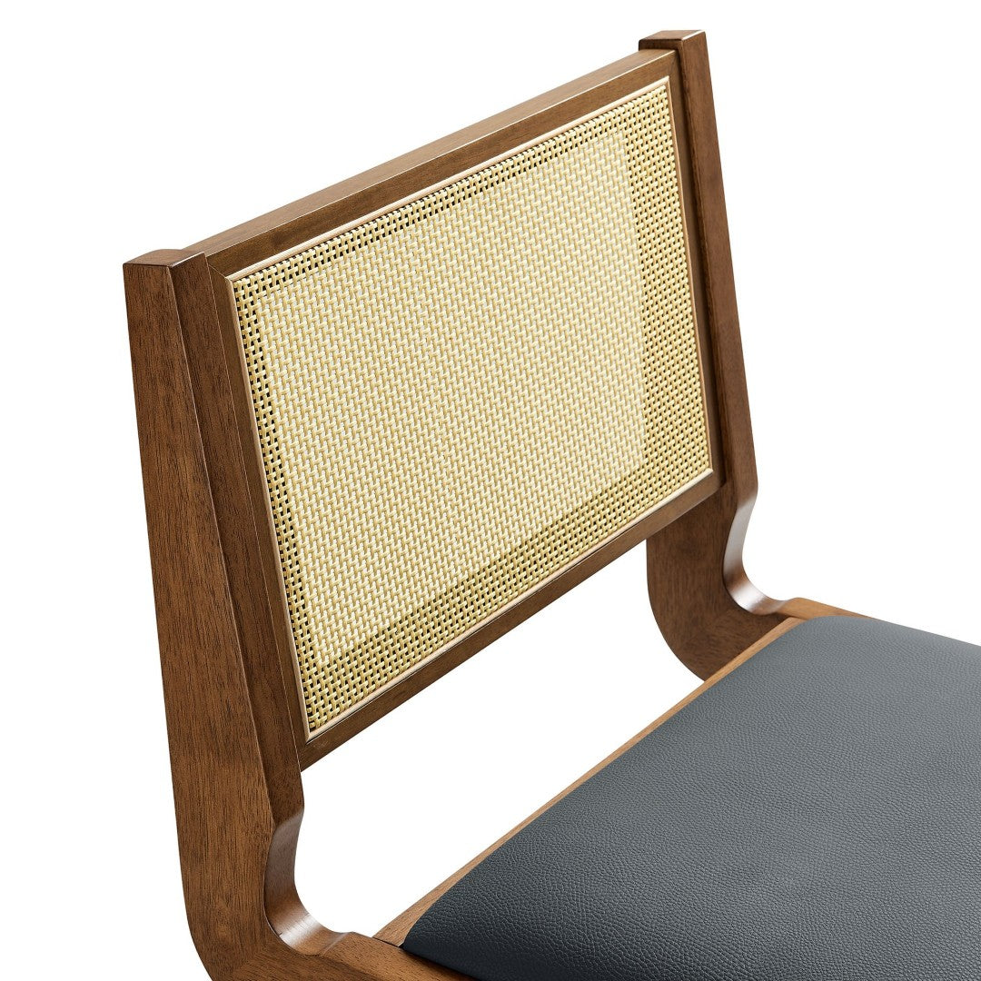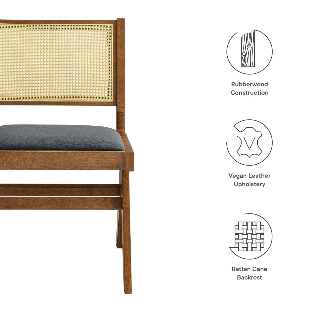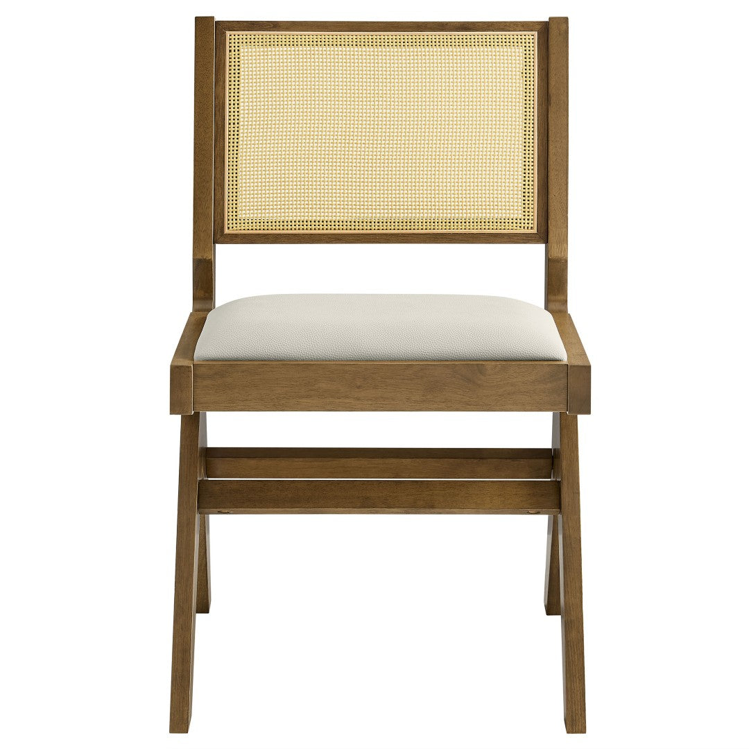 Bring mid-century modern warmth and contemporary texture to your dining space with this set of two armless dining chairs. Combining durable rubberwood construction, breathable rattan cane backs, and plush vegan leather seats, these chairs deliver a refined, versatile look that works equally well around a dining table, in a breakfast nook, or as accent seating in living areas. The splayed A-frame legs with horizontal stretchers provide stable support and a clean geometric profile, while the armless silhouette maximizes comfort and space efficiency.