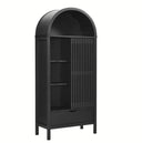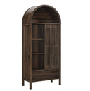 - Arched Display Cabinet Laminate Finish Vertical Slatted Design Sliding Door Adjustable Shelves Assembly Required