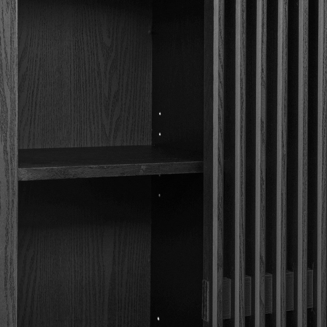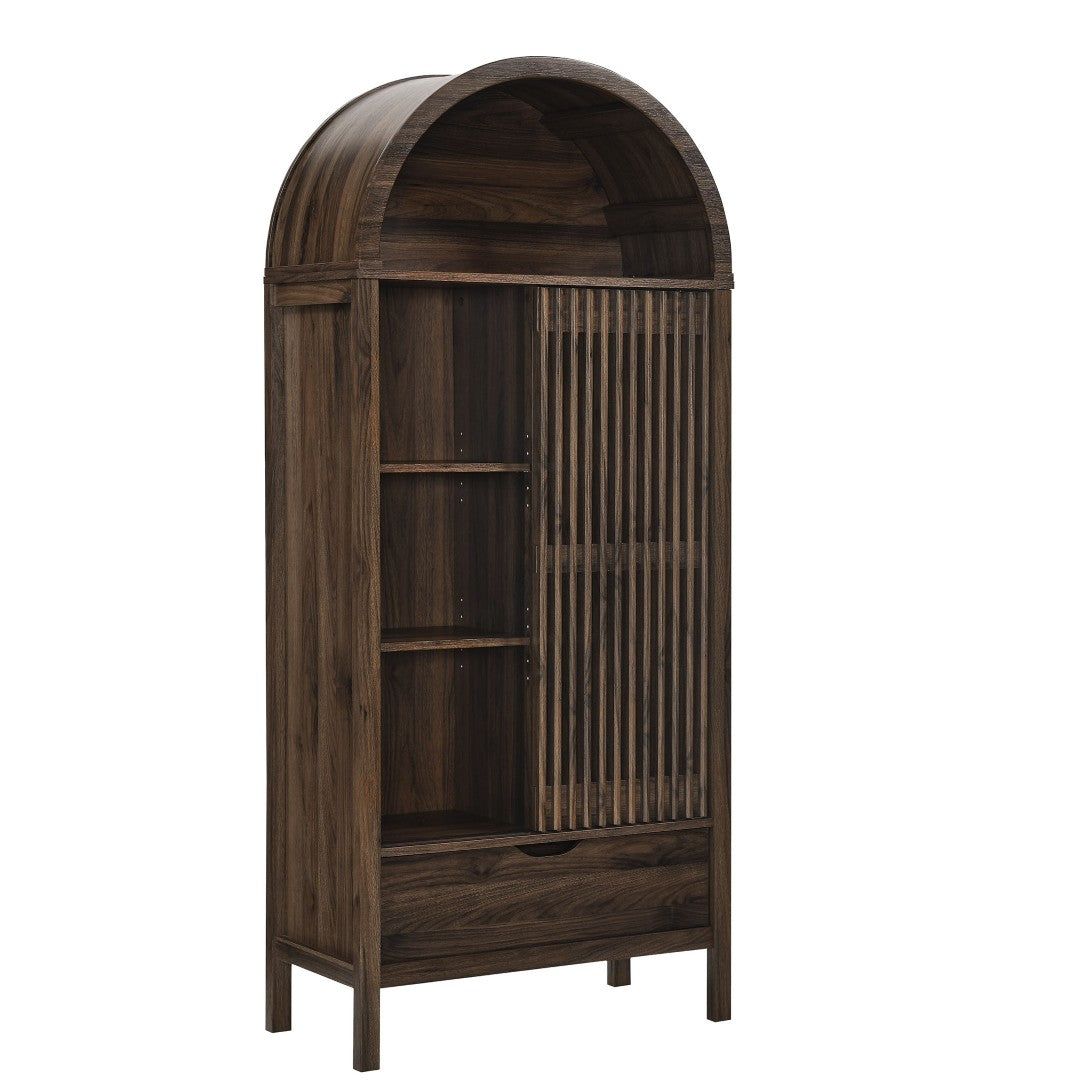 Bring refined, contemporary storage to your home with the Vaughn Arched Display Cabinet. Its sleek laminate finish and distinctive vertical slatted face create a modern focal point while the integrated sliding door offers flexible display or concealment. Thoughtfully designed with a roomy arched top, adjustable shelving, and a bottom drawer, this cabinet balances style and function—ideal for living rooms, dining areas, hallways, or any space that needs organized display and hidden storage. Assembly required.