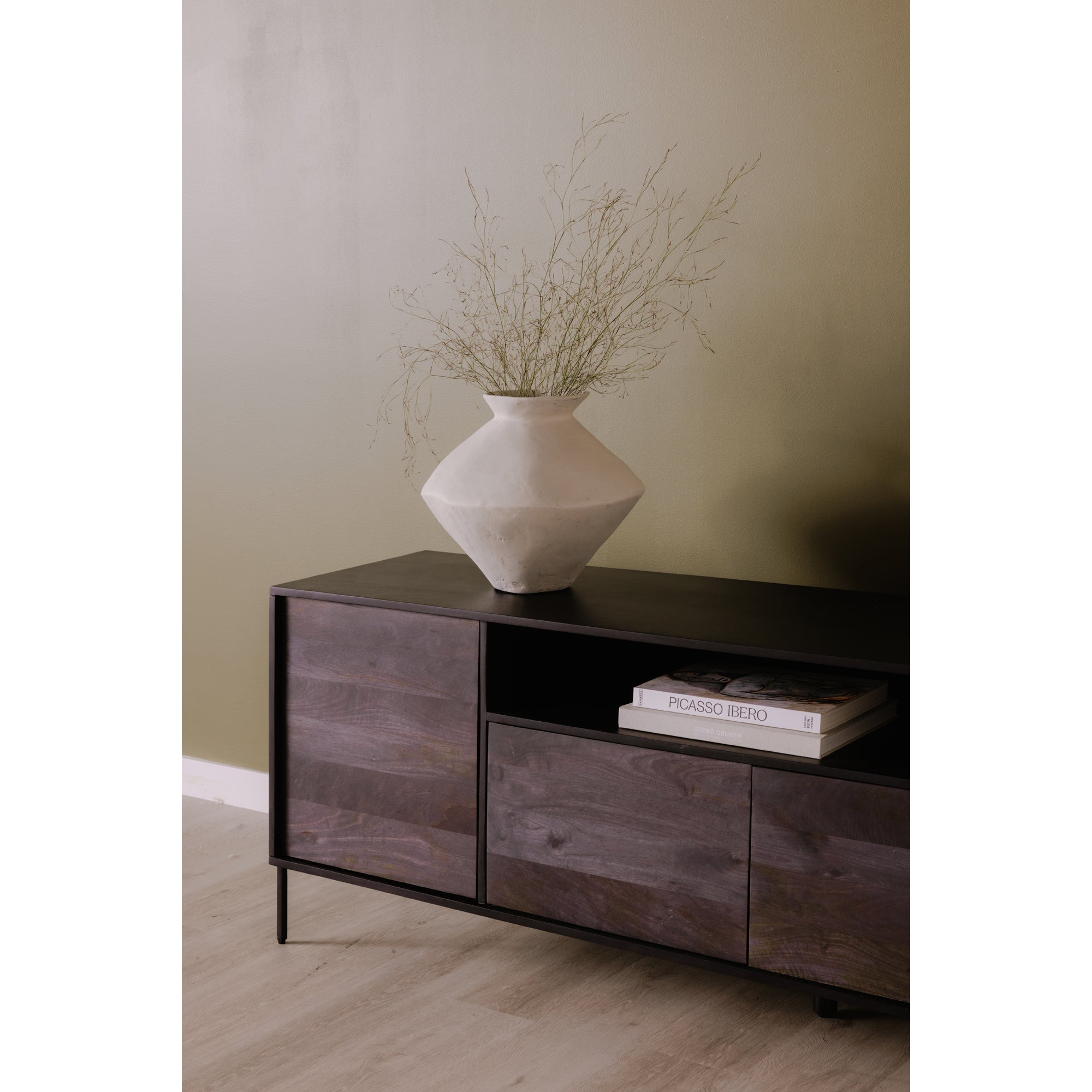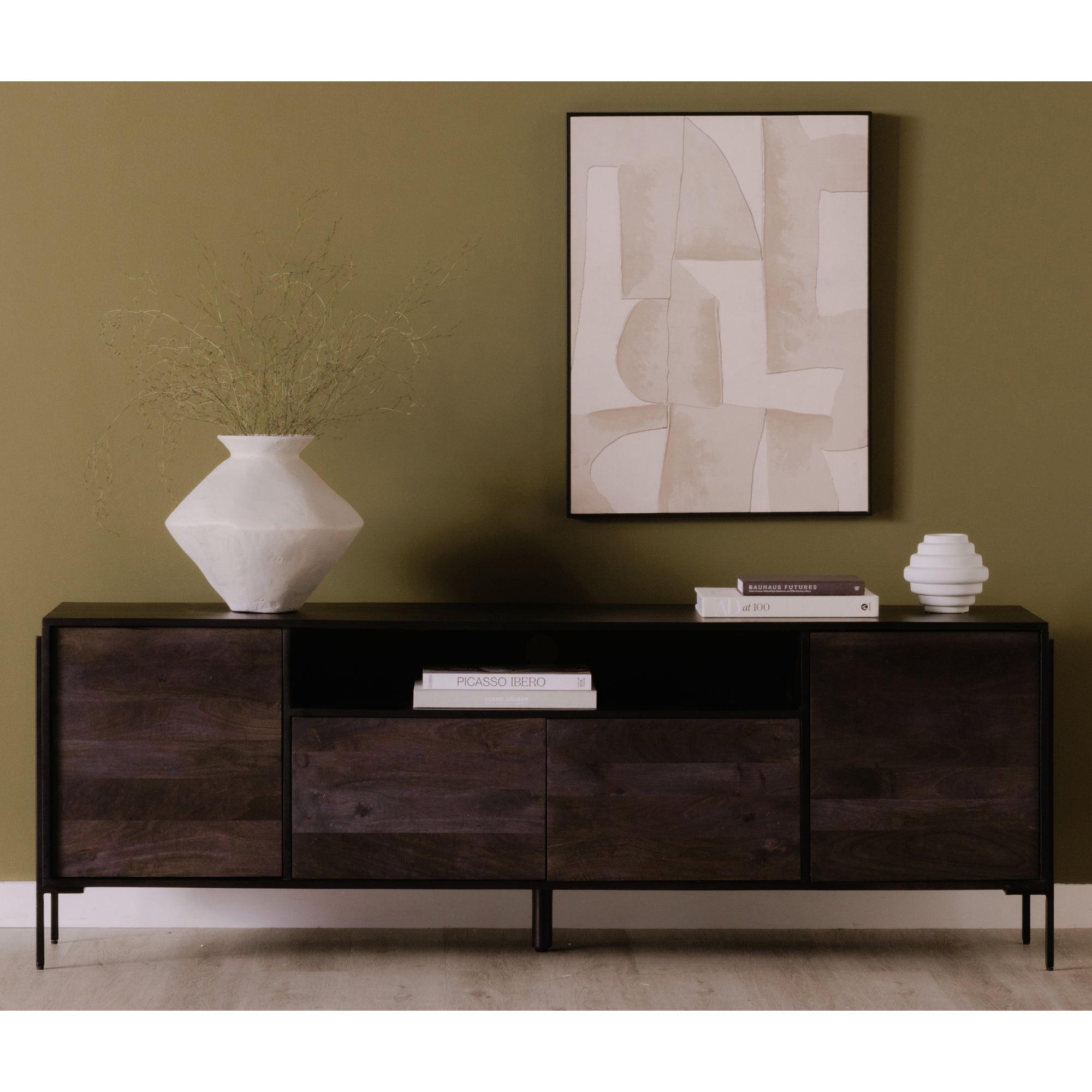- Features and benefits 2: 2 split-level shelves. 1 large middle cupboard and 1 medium-sized open concept shelf. Push-to-open magnet closure with cable cutout for cord management