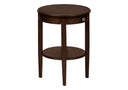 - This 23 inch high espresso brown veneer accent table, with a space saving design is versatile as an end or side table in a living room or as a stylish nightstand in a bedroom.