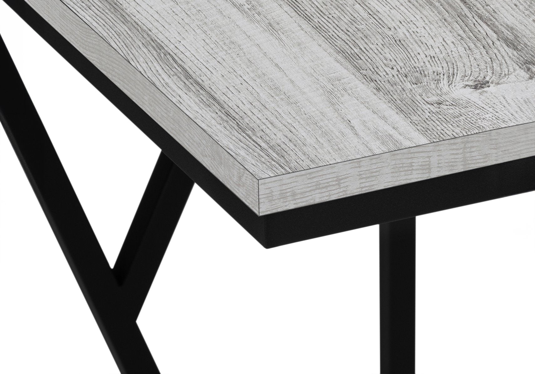 - Features a smooth, grey wood-look rectangular tabletop and black metal frame with asymmetrical triangle detail