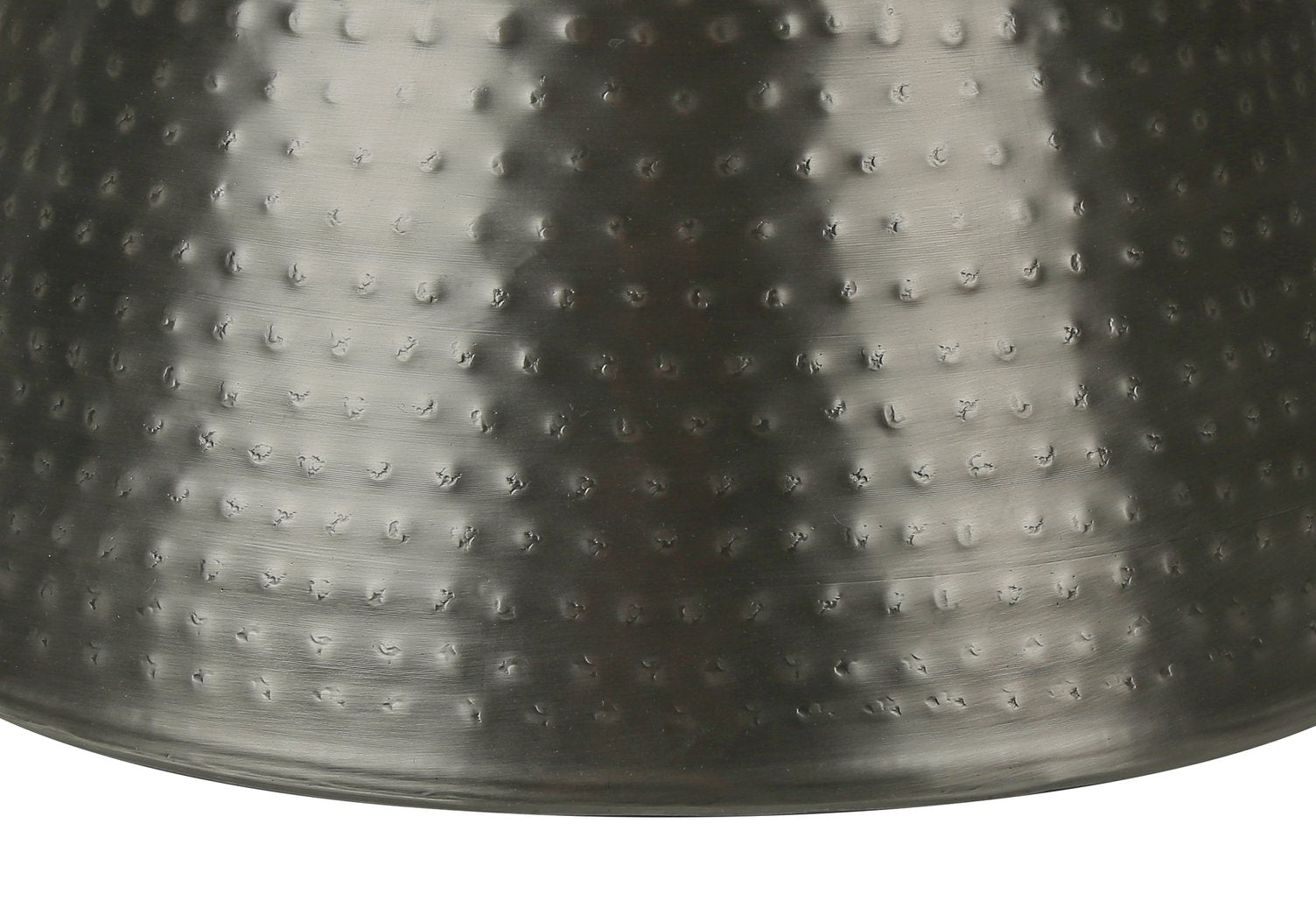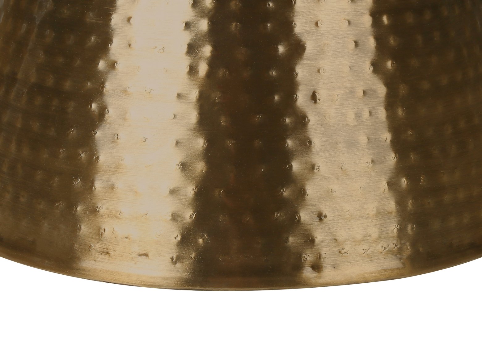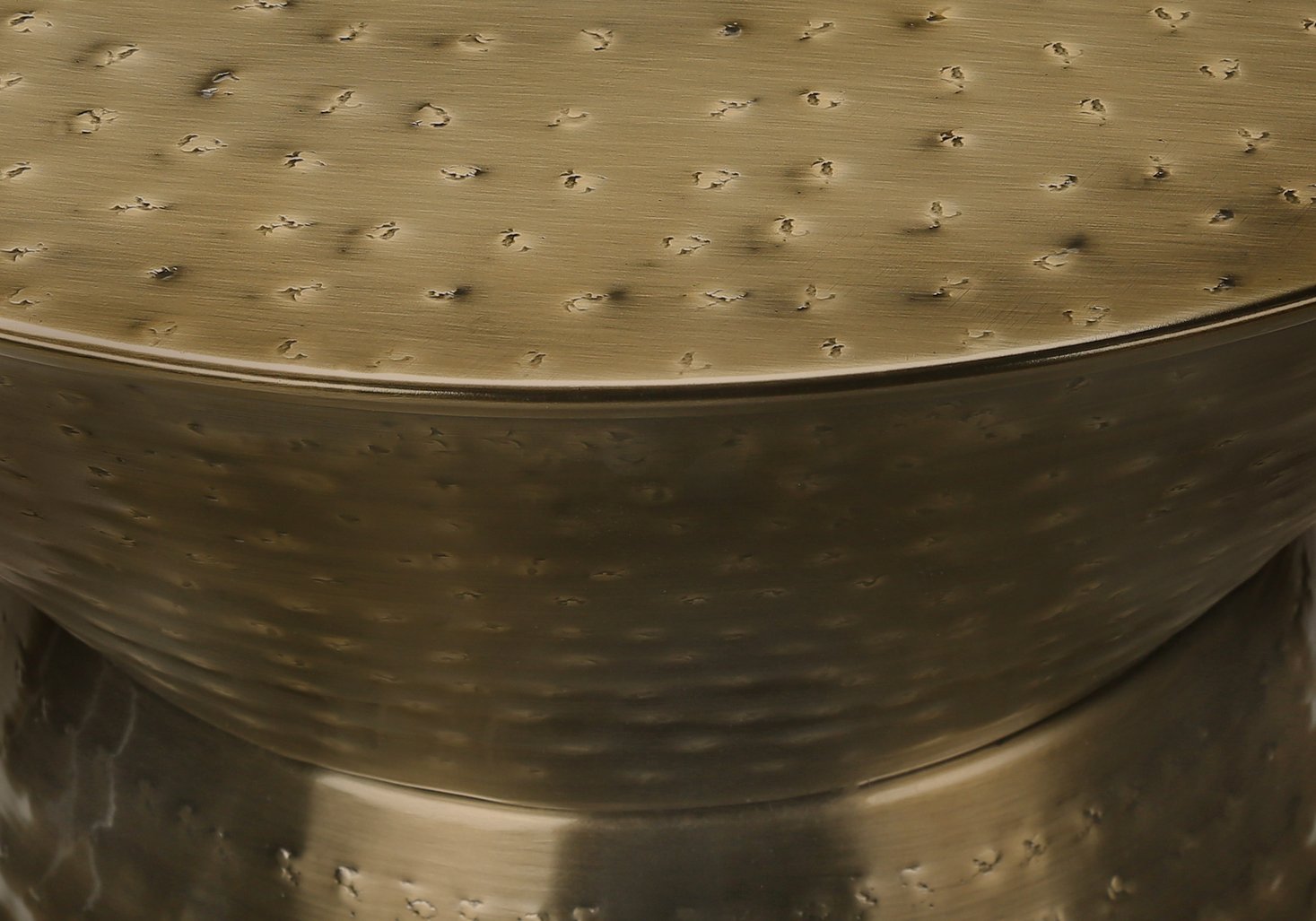 - This hand-crafted, 22" high accent table with a hammered design on all sides, brings a bold and glamourous presence to a room with its sophisticated gold metal finish in a modern hour glass shape.