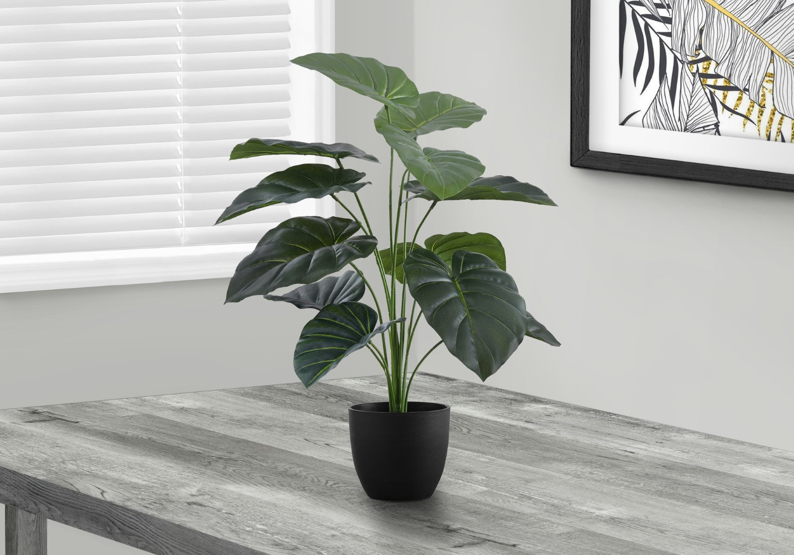 - Add some greenery to your space with this lifelike 24" tall artificial Alocasia plant set in a 5" black pot